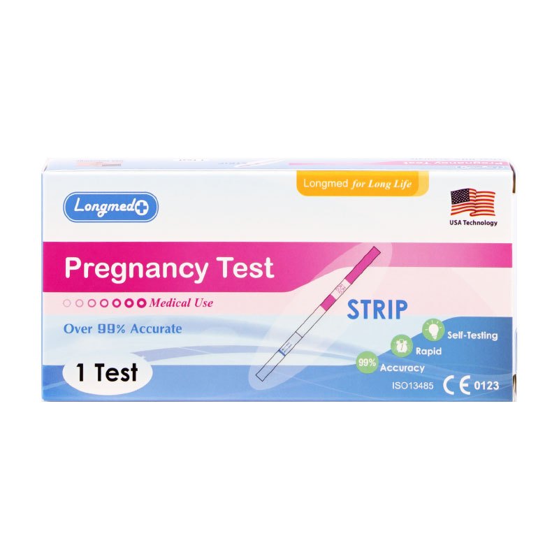 ที่ตรวจการตั้งครรภ์ ลองเมด Longmed pregnancy test รูปแบบ : แบบจุ่ม(strip) แบบหยด(cassette) แบบปากกา(midstream) ขนาดบรรจุ : 1 ชิ้น/กล่อง ++ หลักการ ++ ชุดทดสอบการตั้งครรภ์ ลองเมด ชนิดจุ่ม ใช้หลักการ Immuno Chromatographic Assay ในการตรวจหาฮอร์โมน hCG ( Hum