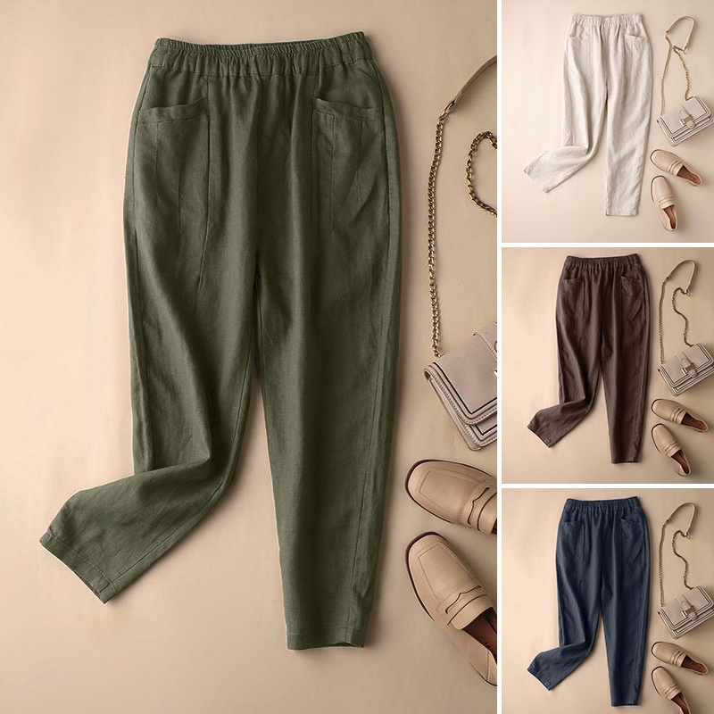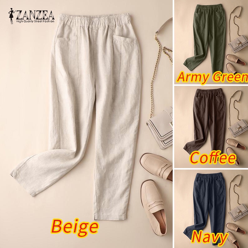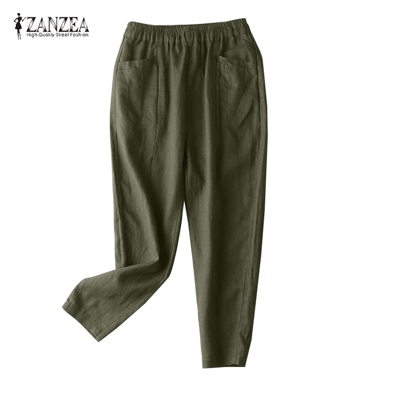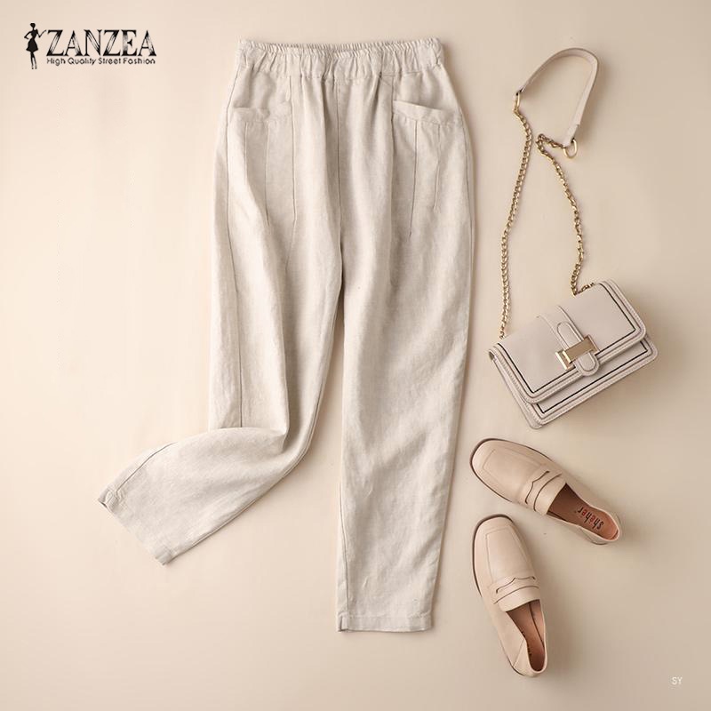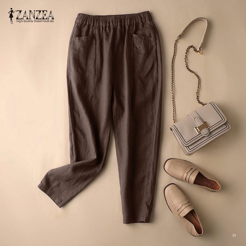 Zanzea กางเกงฮาเร็มลําลอง ผ้าฝ้าย เอวยางยืด ทรงหลวม มีกระเป๋า สไตล์เรโทร สําหรับผู้หญิง