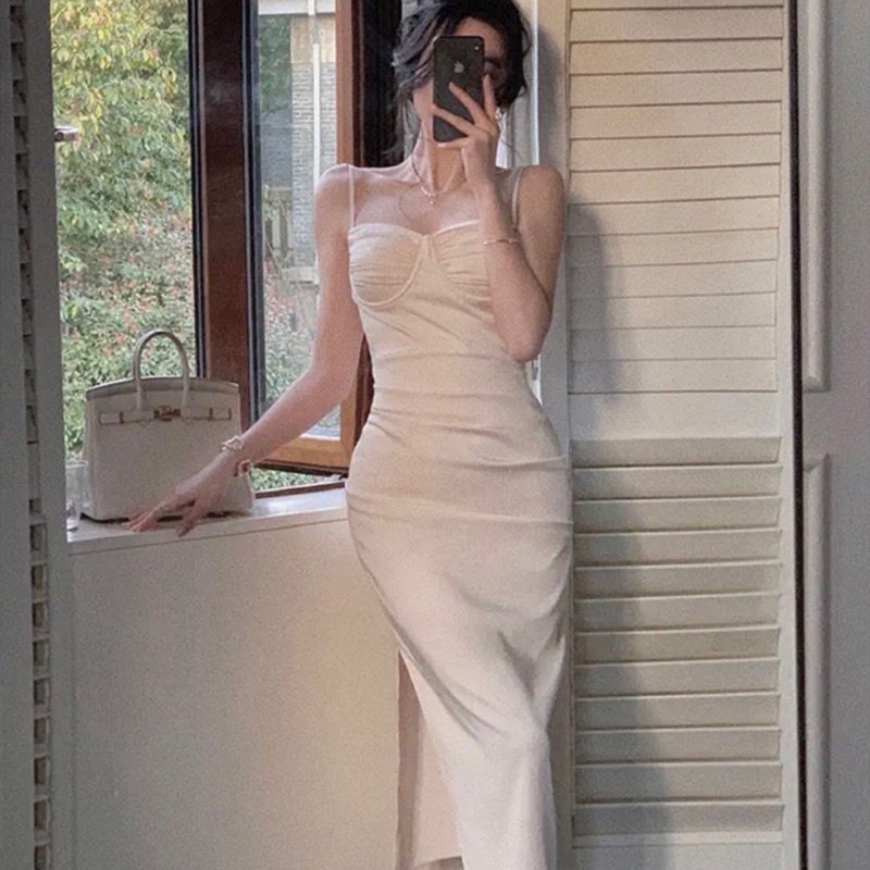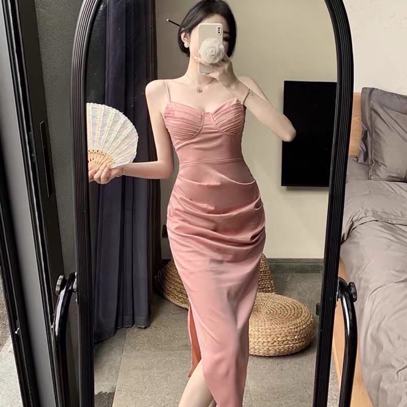 ✨Sakura.official✨519/VB#เดรสสายเดียวชิปหลังเสริมฟองน้ำเนื้อผ้าซาติน#เดรสออกงานเเหวกข้างเปิดหลัง
