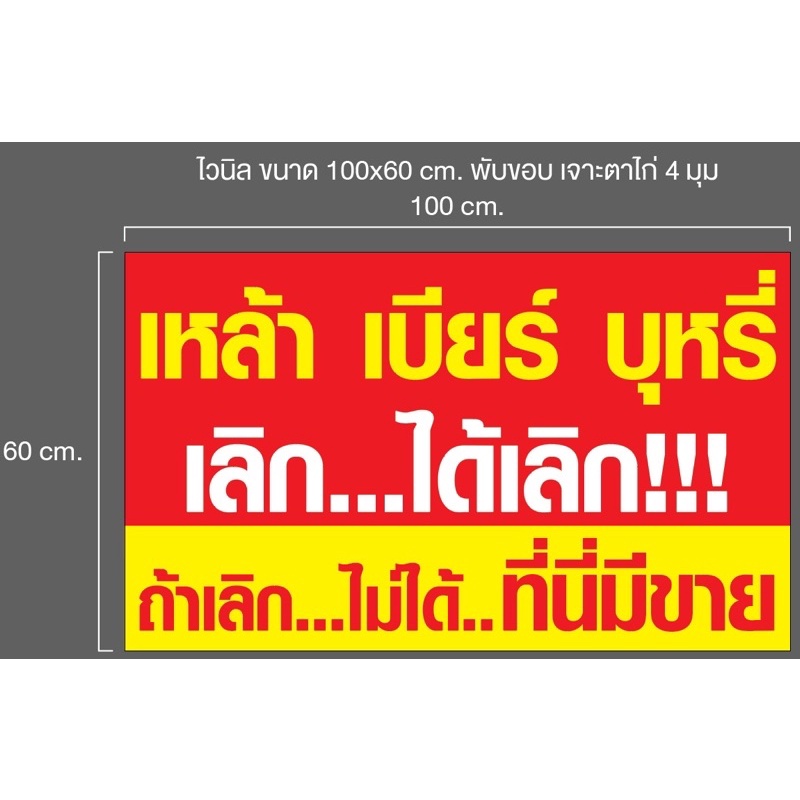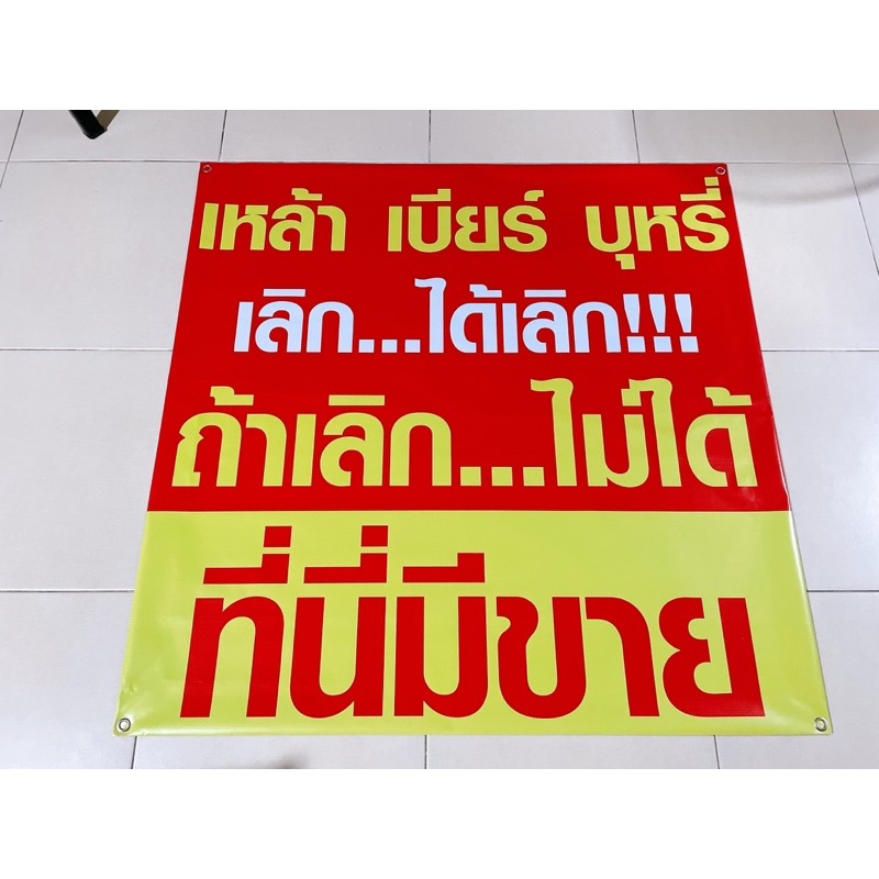ป้ายไวนิล ร้านค้า ร้านชำขายของ เหล้าเบียร์ บุหรี่ ที่นี่มีขาย ขนาด 100×100 cm