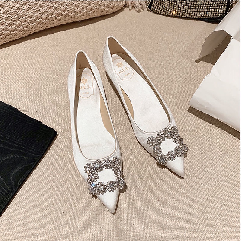 รองเท้าส้นเตี้ย ผ้าซาติน หัวแหลม ประดับพลอยเทียม สีขาว ไซซ์ 33-44 สําหรับผู้หญิง เจ้าสาว