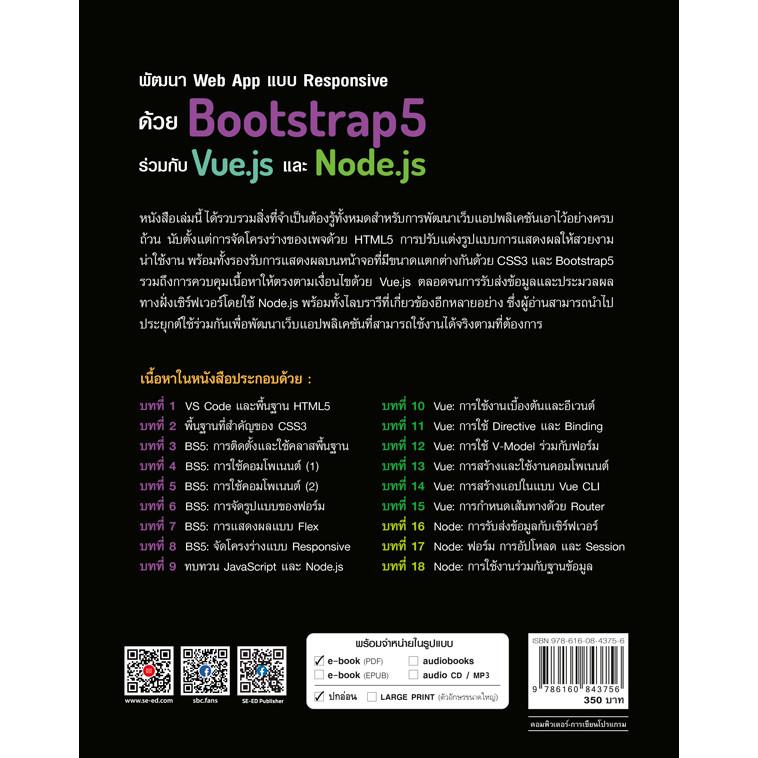 หนังสือพัฒนา Web App แบบ Responsive ด้วย Bootstrap5 ร่วมกับ Vue.js และ Node.jsเล่มนี้ ได้รวบรวมสิ่งที่จำเป็นต้องรู้ทั้งหมดสำหรับการพัฒนาเว็บแอปพลิเคชันเอาไว้อย่างครบถ้วน นับตั้งแต่การจัดโครงร่างของเพจด้วย HTML5 การปรับแต่งรูปแบบการแสดงผลให้สวยงามน่าใช้งาน