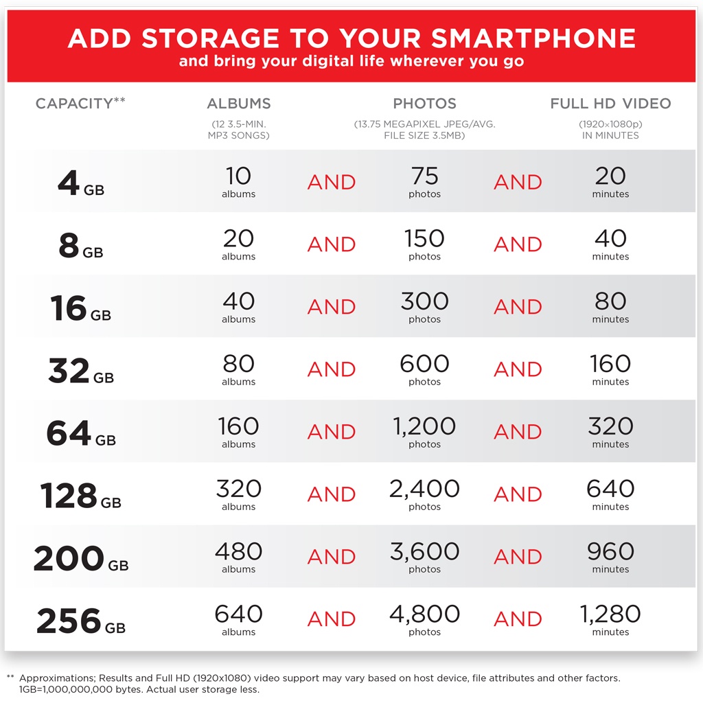 • 32GB, 64GB, 128GB, 256GB, 512GB*