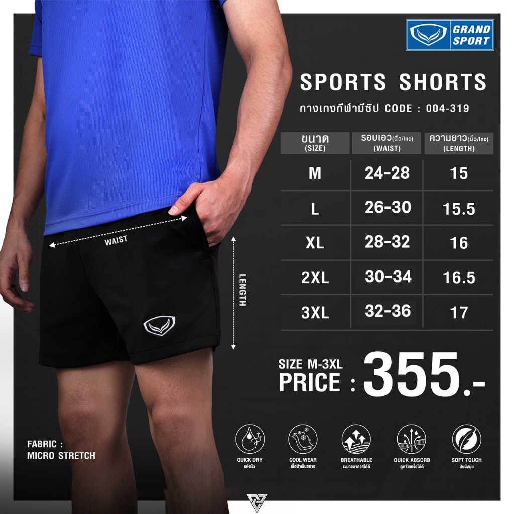 Grand sport 04-319 กางเกงวอลเลย์บอลมีกระเป๋าซิปข้าง ผู้ชาย เนื้อผ้าใหม่ หนา นุ่ม ลื่น ใส่สบายมาก