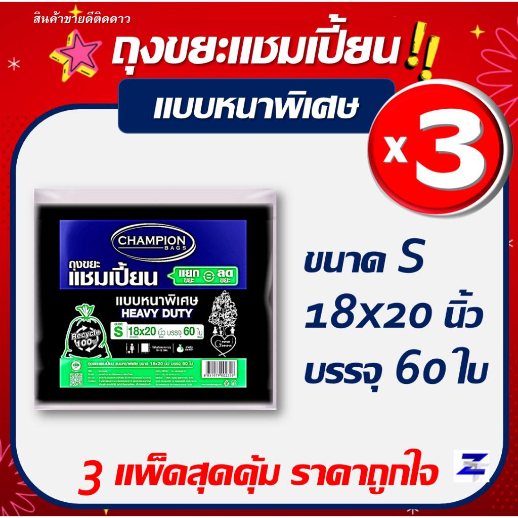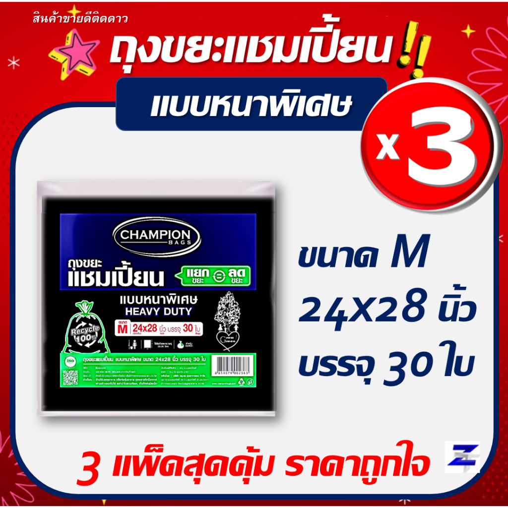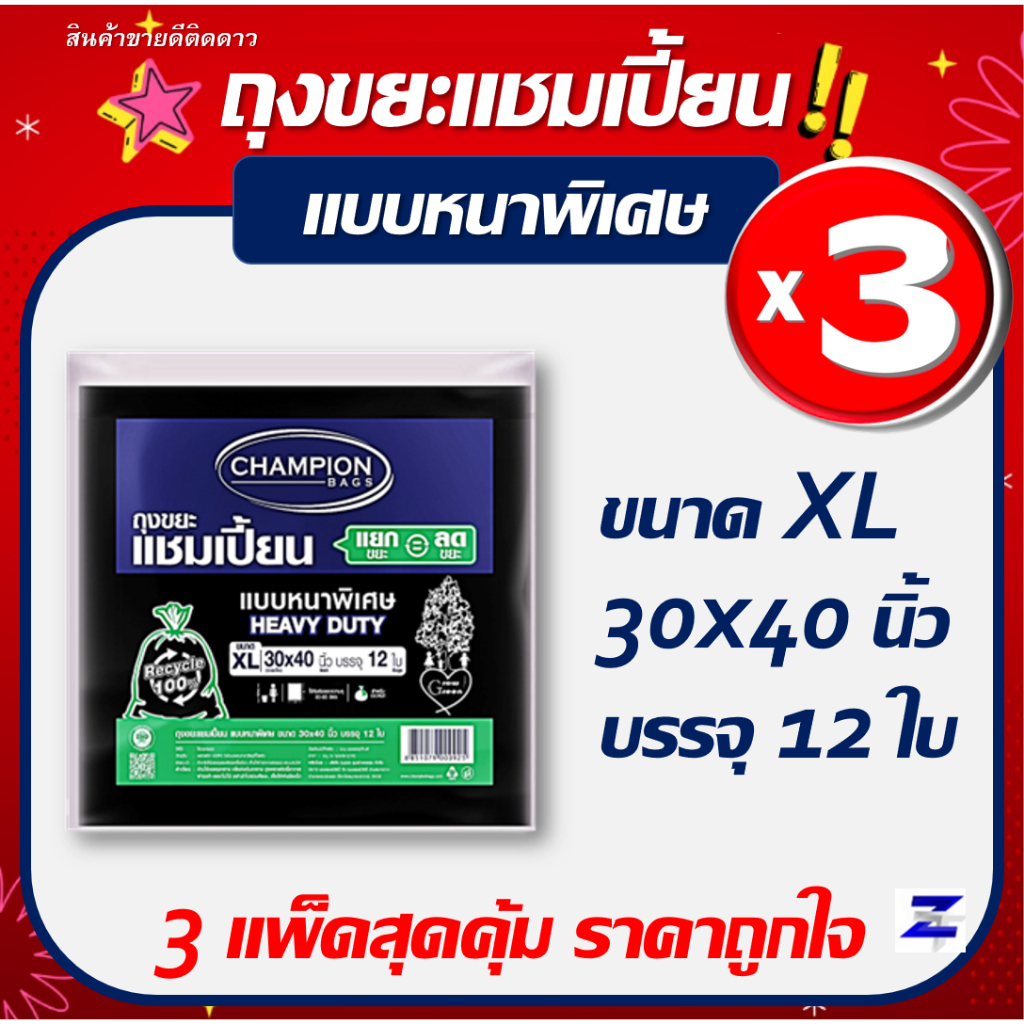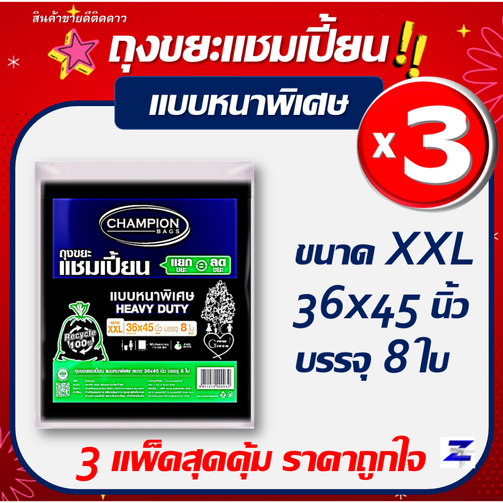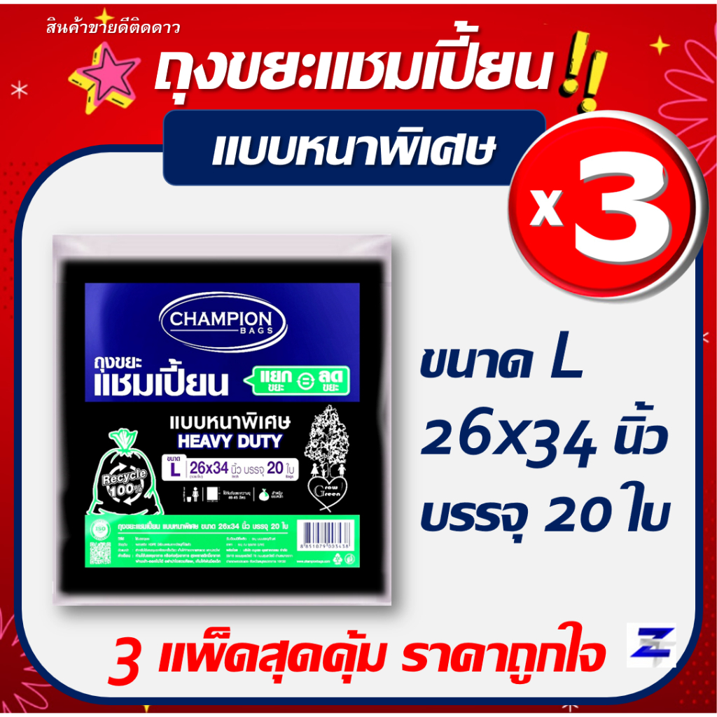 พิเศษแพ็ค3 สุดคุ้ม ถุงขยะแชมเปี้ยน Champion Bags แบบหนาพิเศษ HEAVY DUTY มี 5 ขนาด เนื้อหนา เหนียว รับน้ำหนักได้มาก