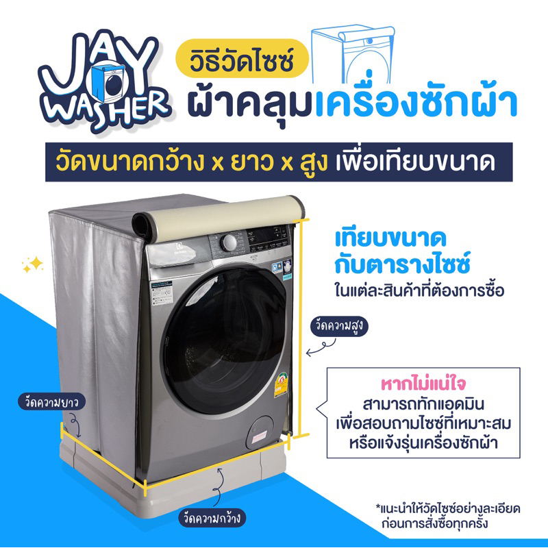 -ควรวัดขนาดเครื่องให้ใกล้เคียงขนาดผ้าคลุม ขนาดผ้าคลุมควรใหญ่กว่าขนาดเครื่องซักผ้า