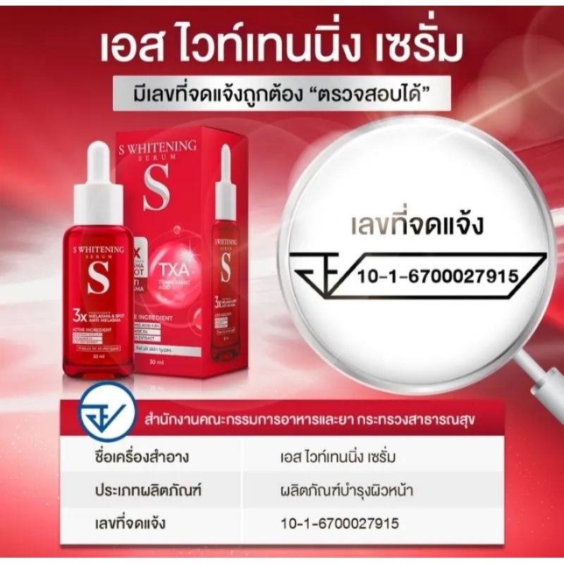 เซรั่ม เอส สลายฝ้า กระ จุดด่างดำ ปรับผิวหน้าให้ขาวกระจ่างใส 1 ขวด ปริมาณ 30 ml
