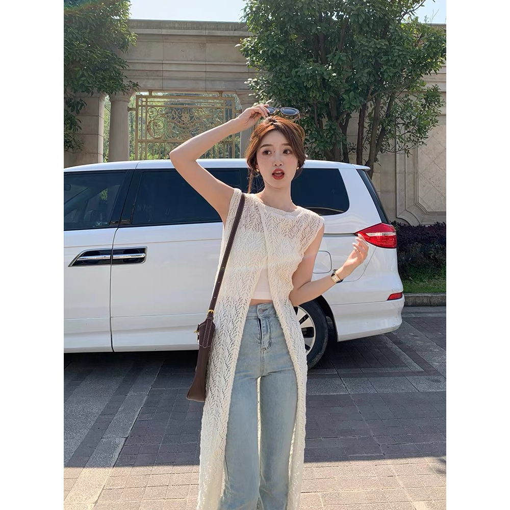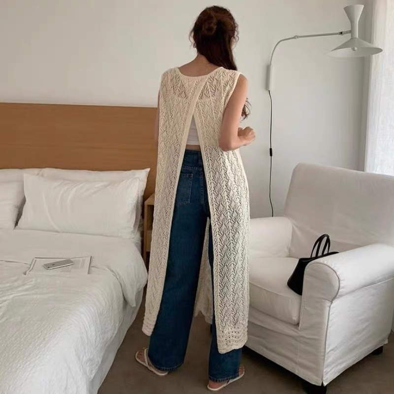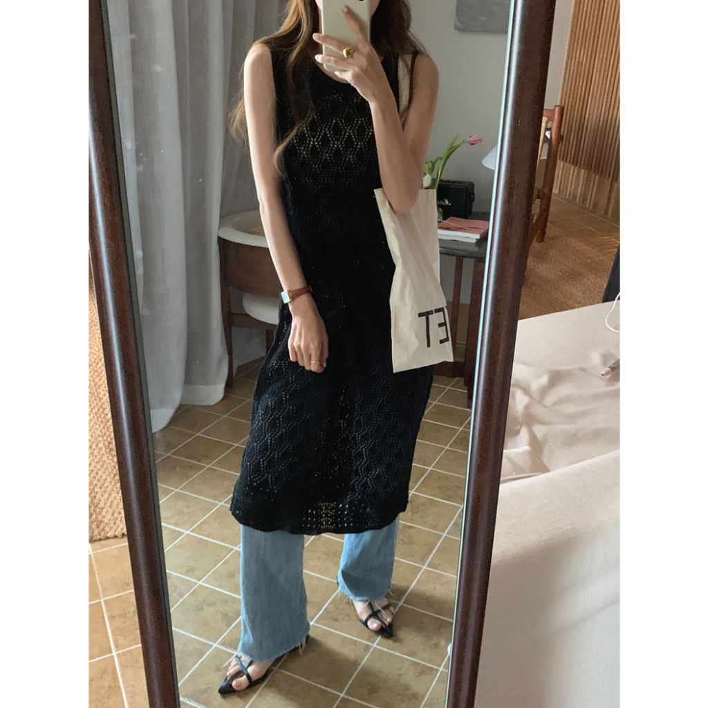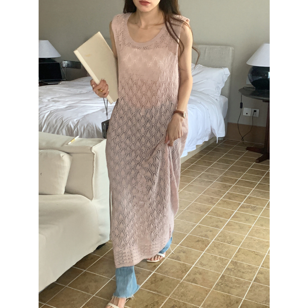 Cicishop(Z1167)ชุดคลุมไหมพรมซีทรู แขนกุด ดีเทลใส่ได้2ด้าน สไตล์น่ารักเบาๆ