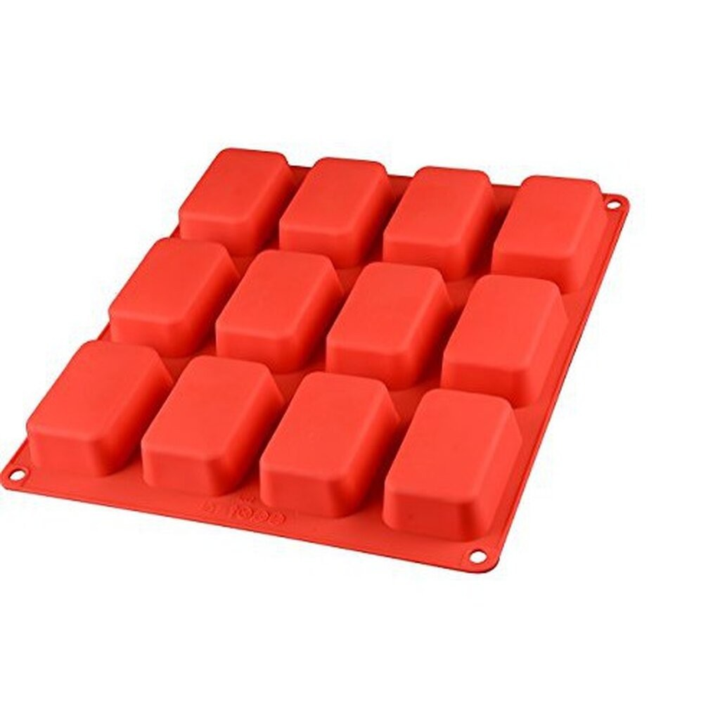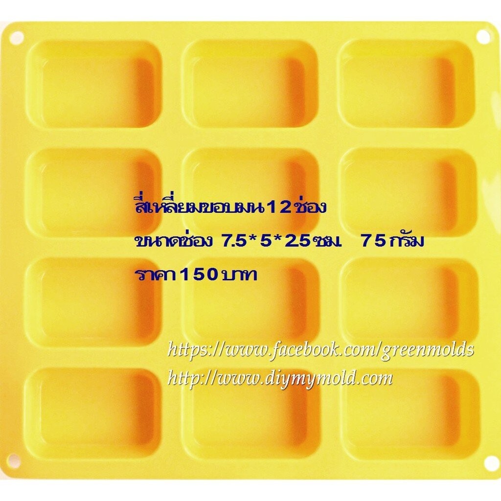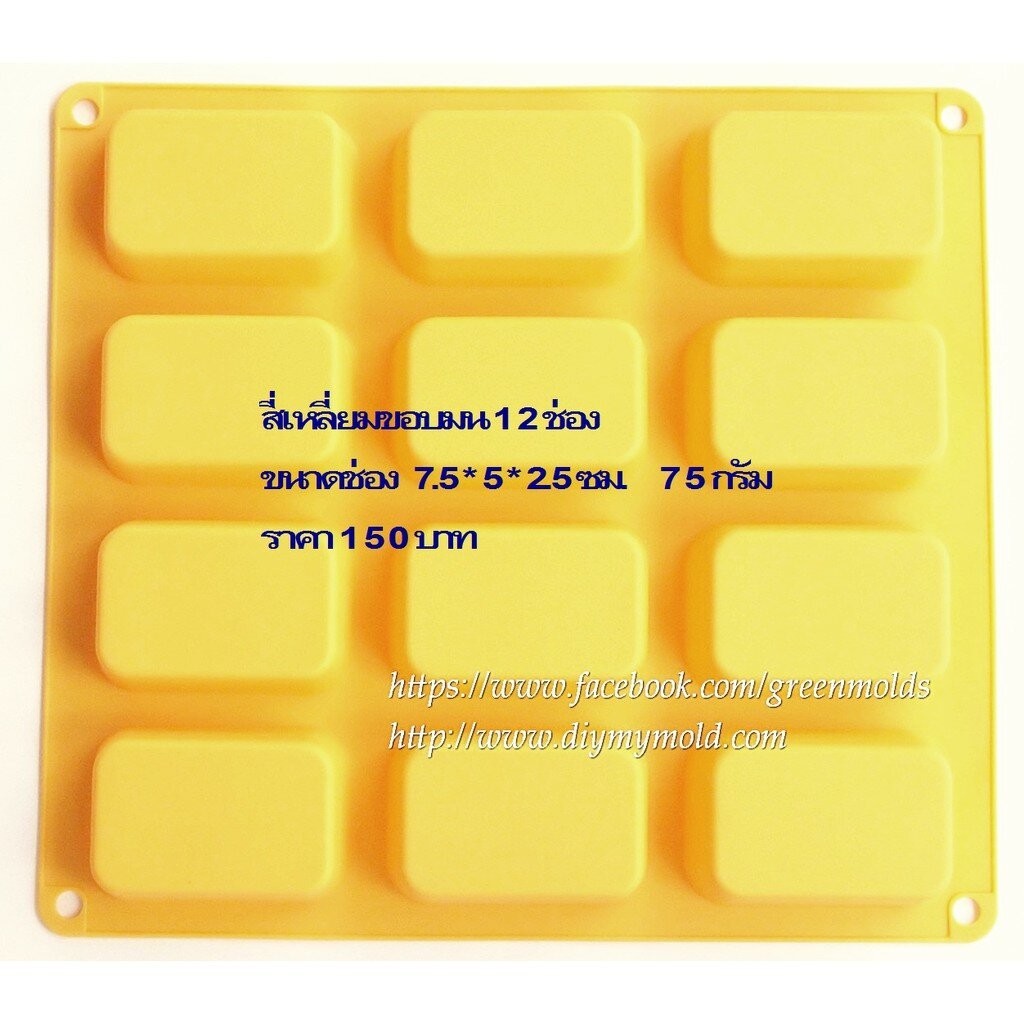 แม่พิมพ์สบู่ ทำมาจากซิลิโคนนิ่ม ทรงสี่เหลี่ยมขอบมน 12 ช่อง ๆ ละ 75-80 กรัม