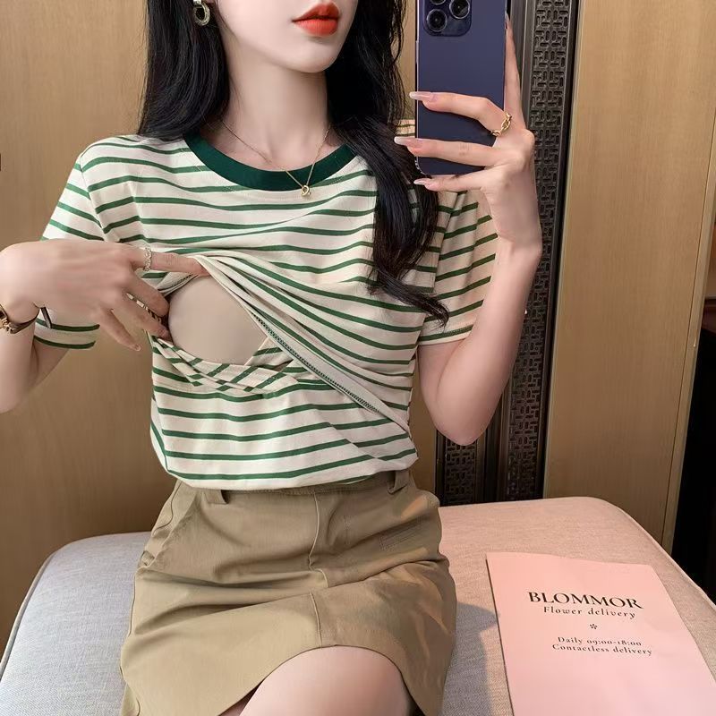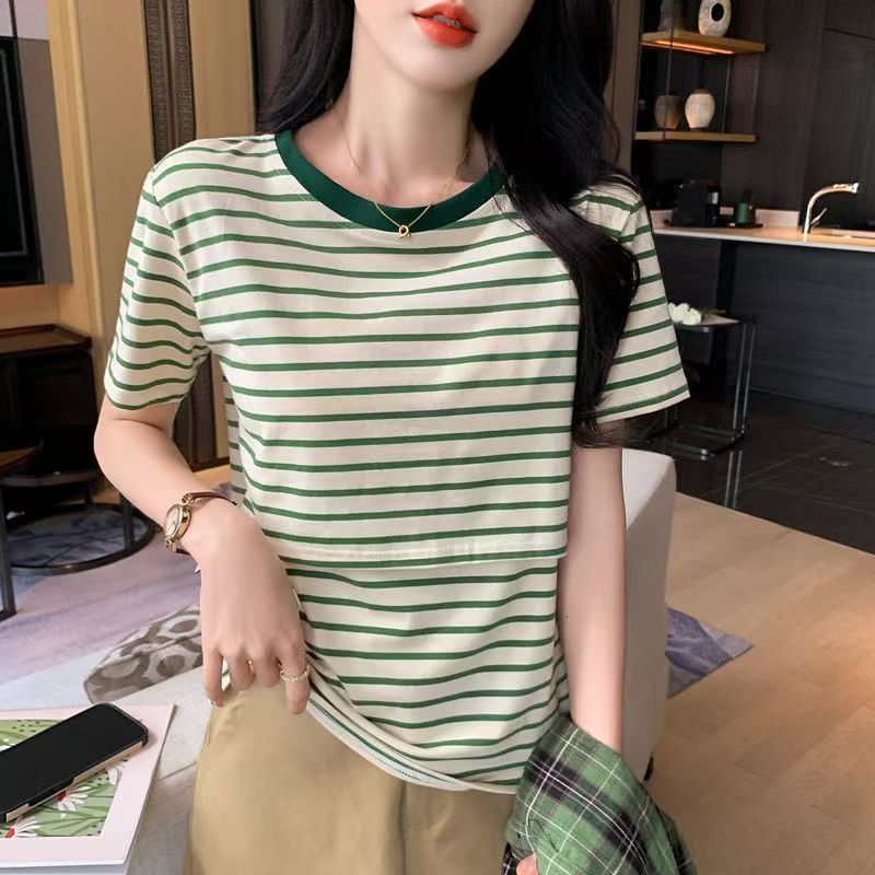 95%ผ้าฝ้าย ชุดให้นมบุตร ทำให้ดูผอมเพรียว ลายทาง แขนสั้นTเสื้อ เสื้อท่อนบน