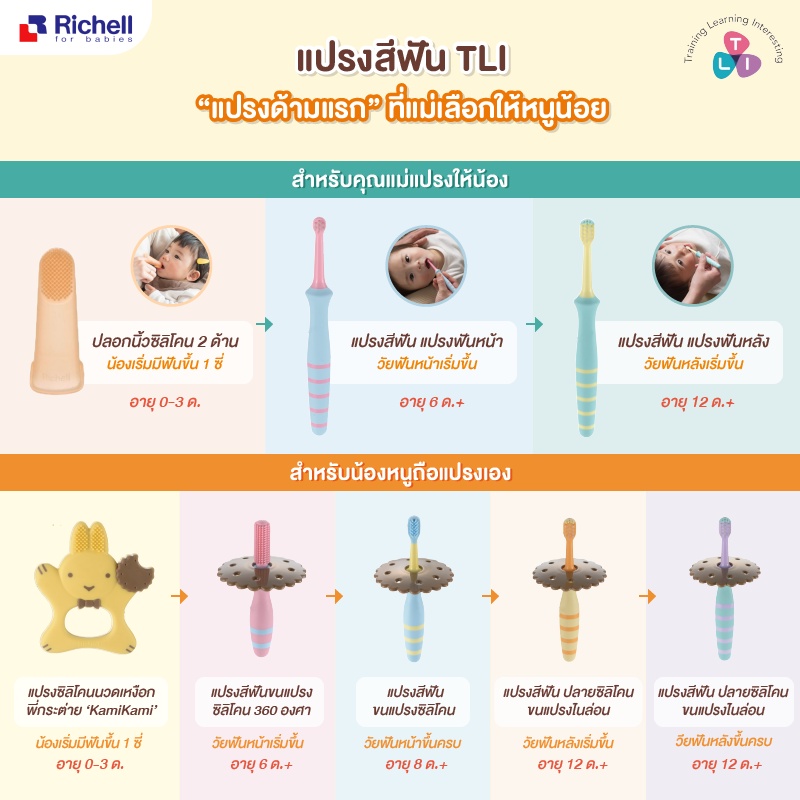 แปรงสีฟันเด็ก รุ่น TLI โดยรุ่นนี้ได้มีการออกแบบรูปร่าง และขนแปรงแต่ละแบบจากญี่ปุ่น โดยคิดค้นจาก Concept เรื่องพัฒนาการฟันเด็กตั้งแต่แรกเกิด จนถึงวัย1ขวบขึ้นไป โดยแต่ละรุ่นได้ปรึกษาและให้คำแนะนำเรื่องพัฒนาการเด็กจากค