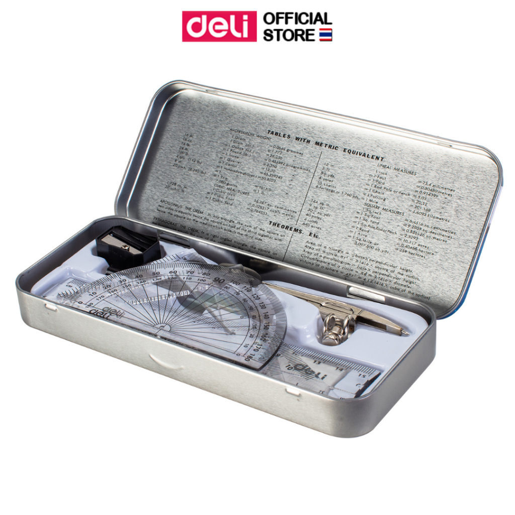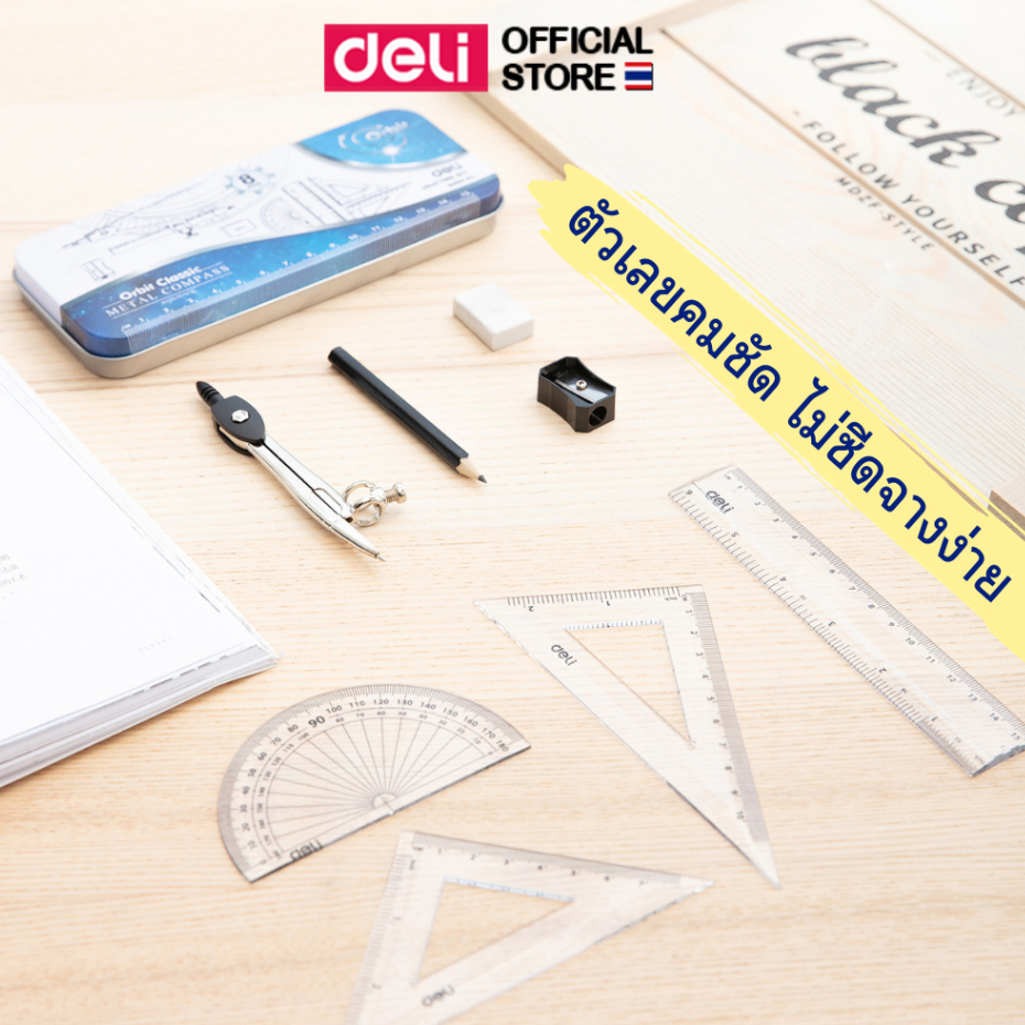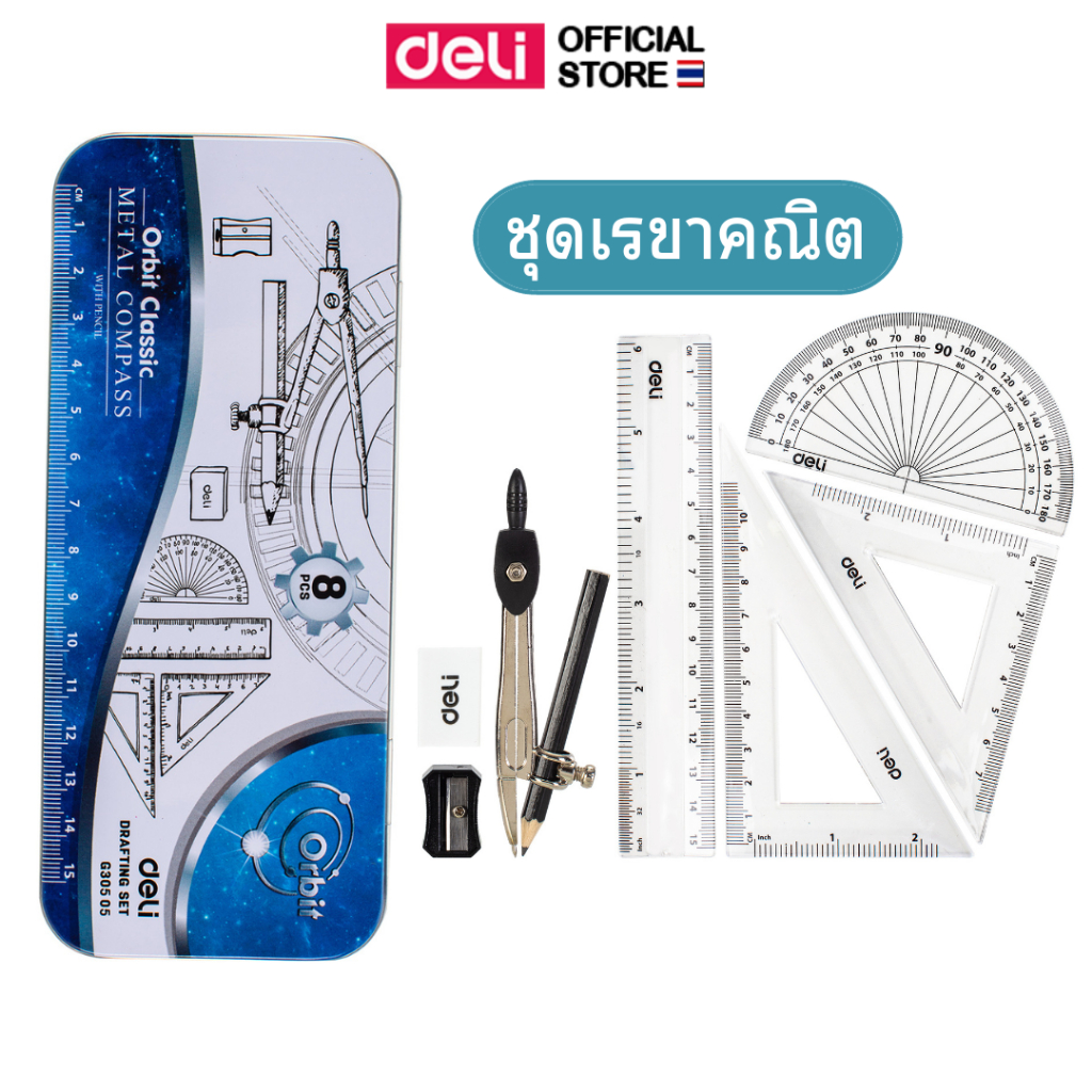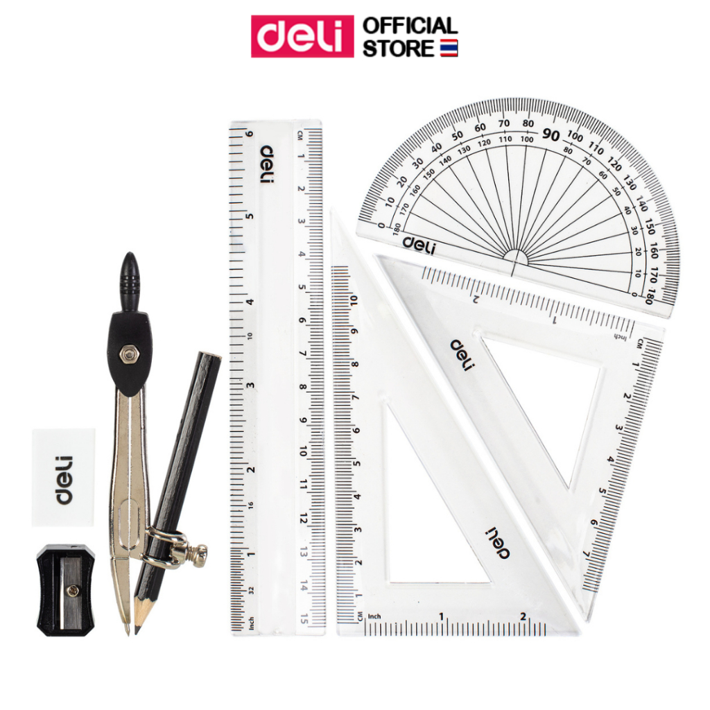 ชุดเรขาคณิต Deli ชุดวงเวียน ครบเซต ไม้บรรทัด ชุดไม้บรรทัดพลาสติก ชุดวงเวียนพลาสติก ครึ่งวงกลม วงเวียน อุปกรณ์การเรียน