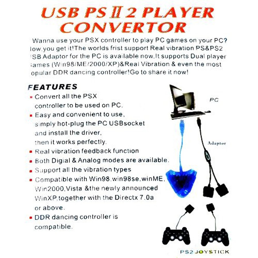อะแดปเตอร์แปลงสาย USB Controller Gamepad สำหรับ Sony PlayStation 2/PSX/PS1/PS2/Joypad PC USB PS2