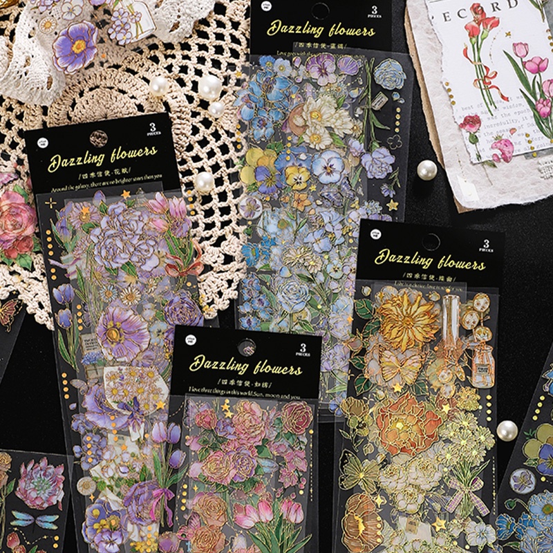 สติกเกอร์ PET สีบรอนซ์ใส ลายดอกไม้ 3D สําหรับติดตกแต่ง 3 แผ่น