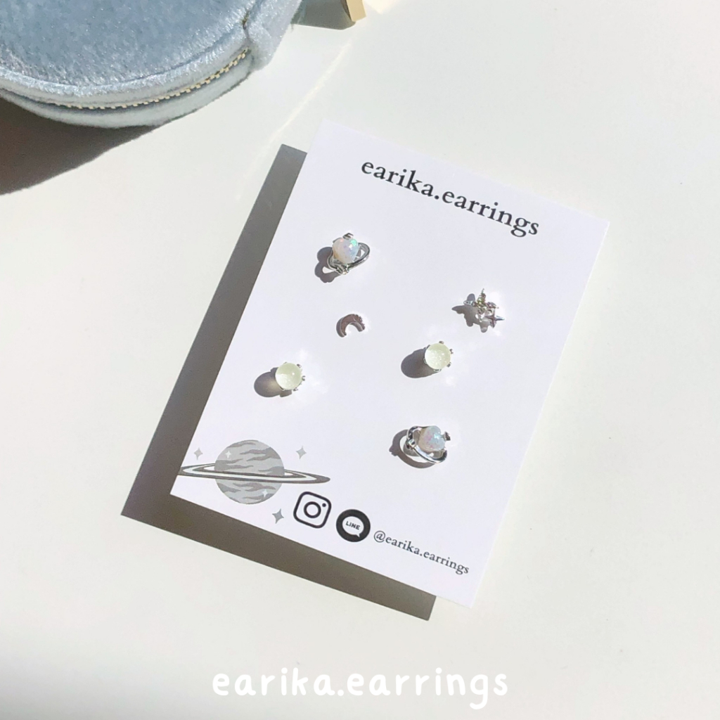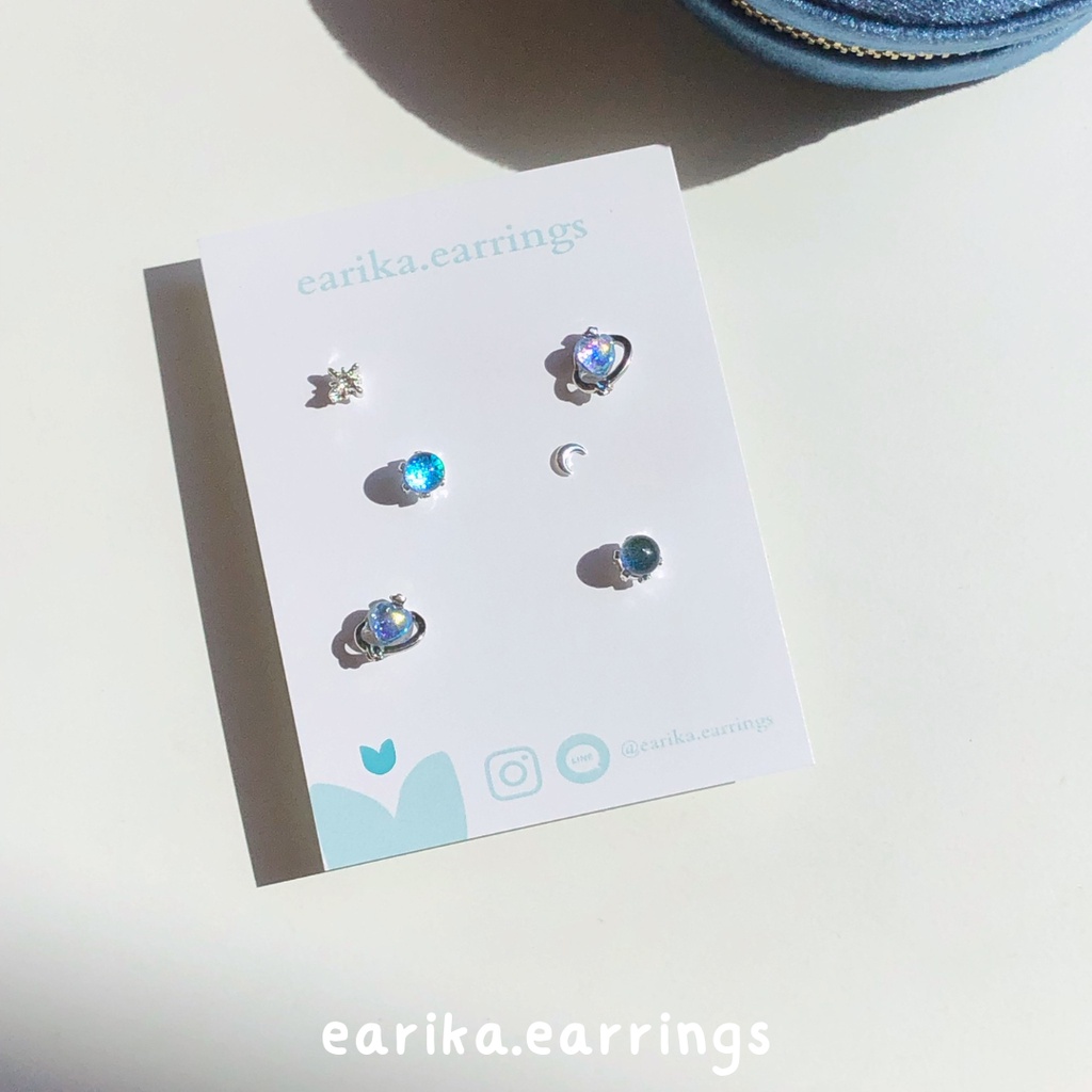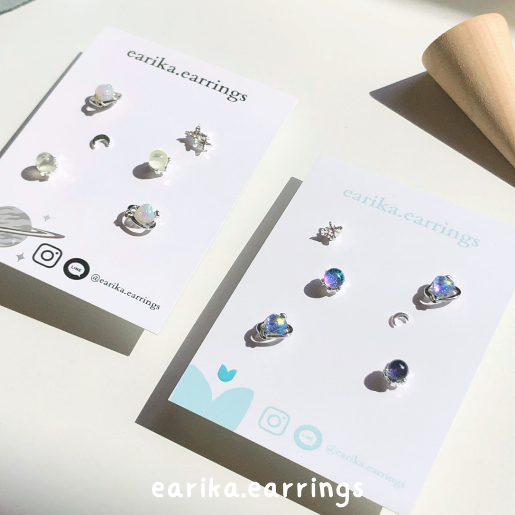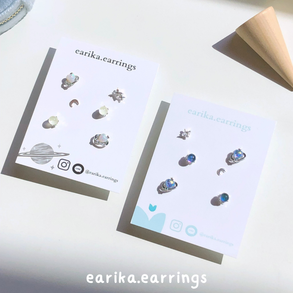 เซ็ตต่างหูก้านเงินแท้ลายดาวเคราะห์หัวใจ ขนาดต่างหู 6-9 mm มีทั้งหมดสองสี สีขาวโอปอล/น้ำเงินกาแล็คซี่ เซ็ตรุ่นนี้โดนแสงหรือแดดแล้ววิบวับ เล่นแสงดีมากๆเลยค่า แนะนำสุดๆ วัสดุก้านเงินชุบทองคำขาว #ear