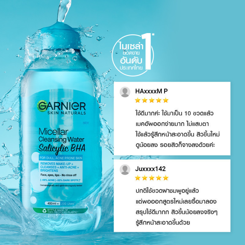 [แพ็คคู่สุดคุ้ม] การ์นิเย่ ไมเซล่า คลีนซิ่ง วอเตอร์ ซาลิไซลิค บีเอชเอ Blue 400มล. GARNIER MICELLAR CLEANSING WATER SALIC