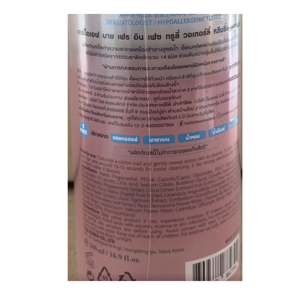 Faith in Face Truly Waterly Cleansing Water 500mlผลิตภัณฑ์เช็ดทำความสะอาดเครื่องสำอางค์สูตรน้ำอ่อนโยนสำหรับทุกสภาพผิวแม้ผิวแพ้ง่าย พร้อมสารสกัดจากธรรมชาติ 14 ชนิดช่วยเติมความชุ่มชื้นให้ผิว พร้อมเป็นโทนเนอร์เพื่อเตรียมผิวสำหรับขั้นตอนต่อไป ผ่านการทดสอบกา