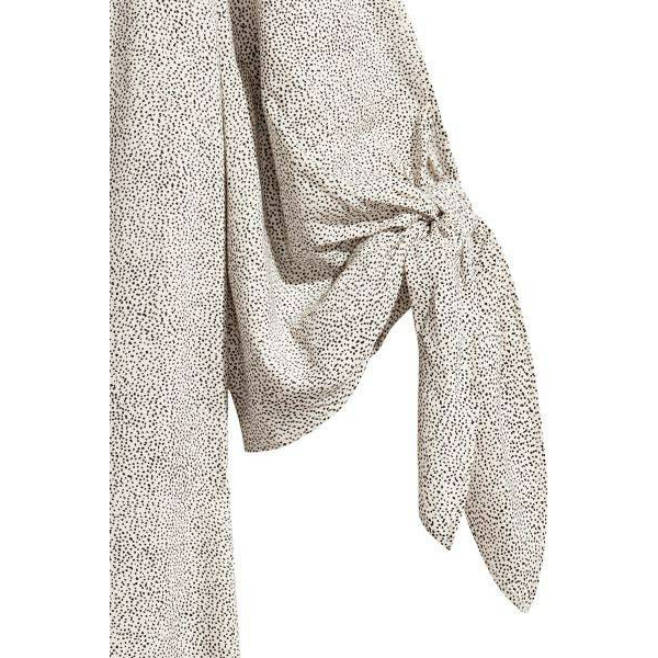 เดรสสั้นทรงตรง ผ้าเครปทอลาย แขนบานกว้าง ผ่าและผูกเน็คไท สีขาวลายจุด