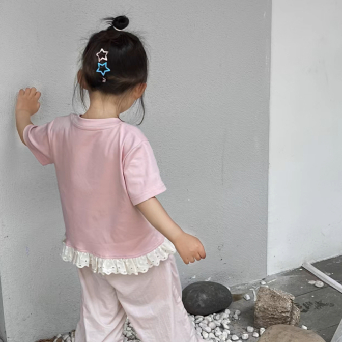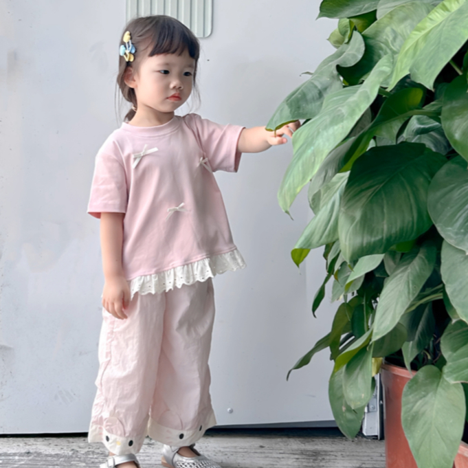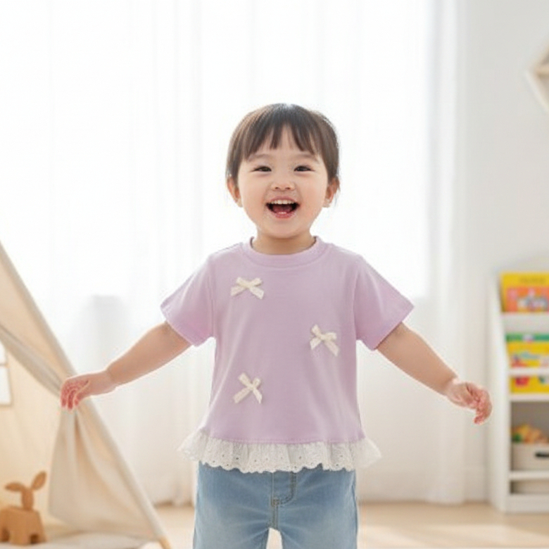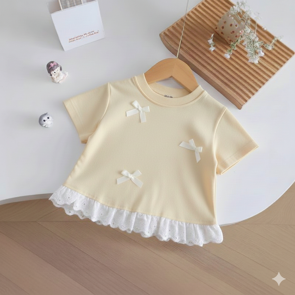 Babyonline(Y432)A3,4 (ส่งด่วน1วัน)เสื้อยืดแฟชั่นเด็กผู้หญิงปักโบว์ชายเสื้อแต่งระบายผ้าลูกไม้ ผ้านุ่ม ใส่สบาย