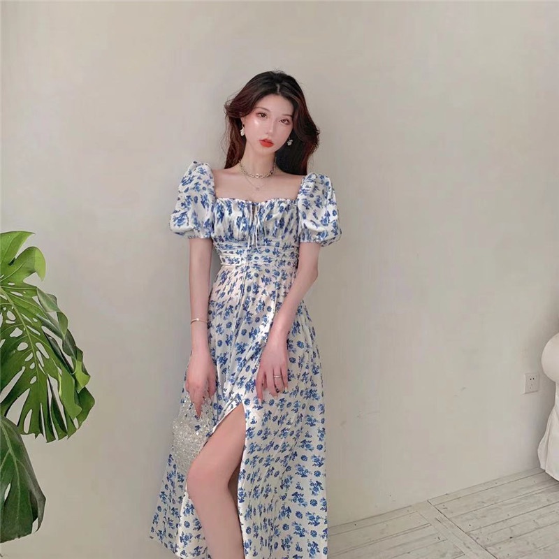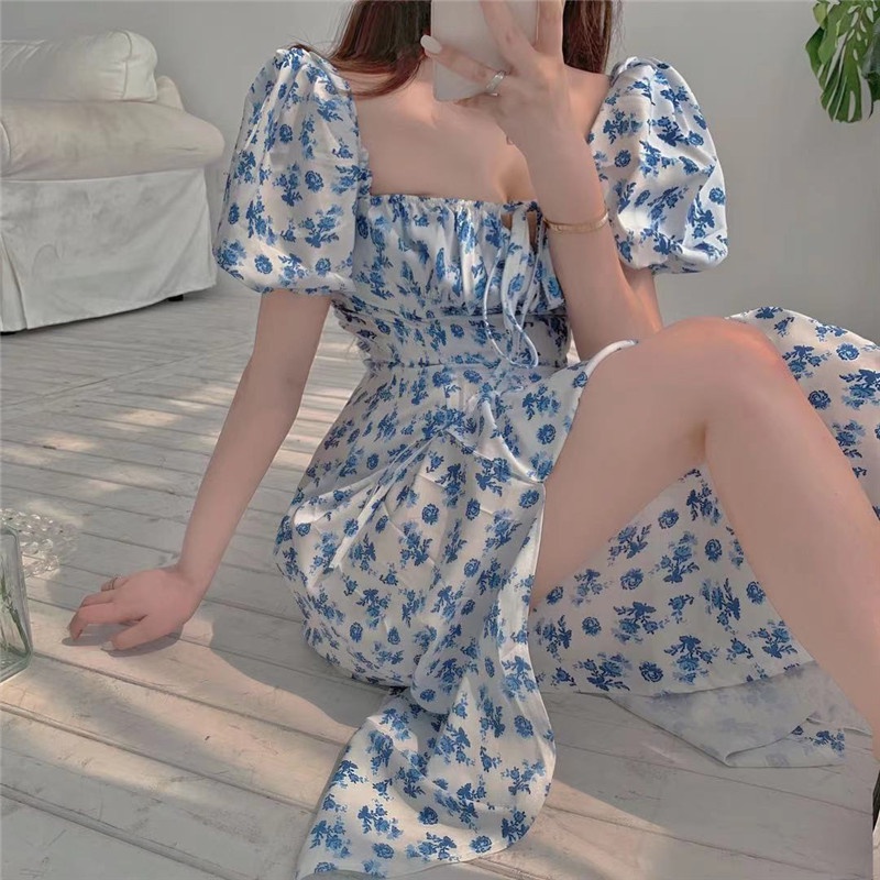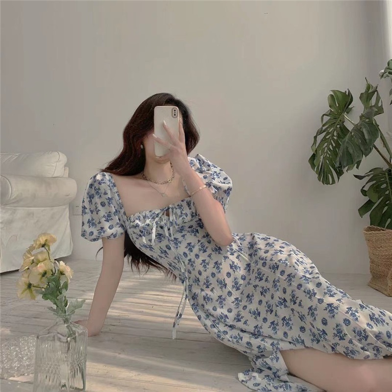cherryshop พร้อมส่ง?เดรส?ชุดเดรสแขนสั้นสีน้ำเงินลายดอกไม้สไตล์เกาหลี