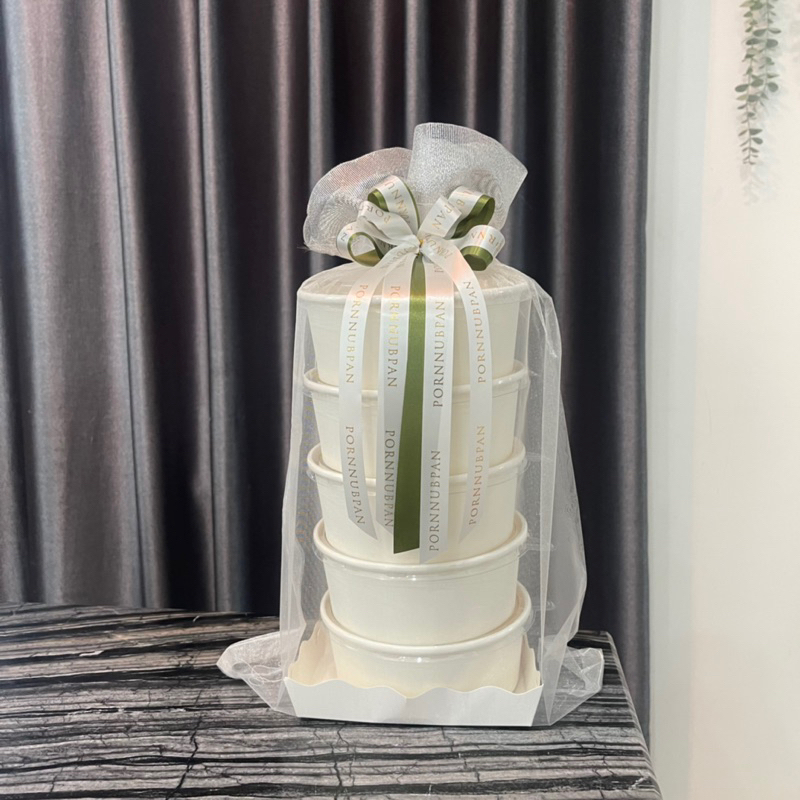 แพคเกจปิ่นโตอาหารถวายพระ ถ้วยกระดาษคราฟท์ กระดาษขาว ขนาด 750 ml. พร้อมฝาปิด (ริบบิ้นมีหลายสีให้เลือก แจ้งทางแชท)