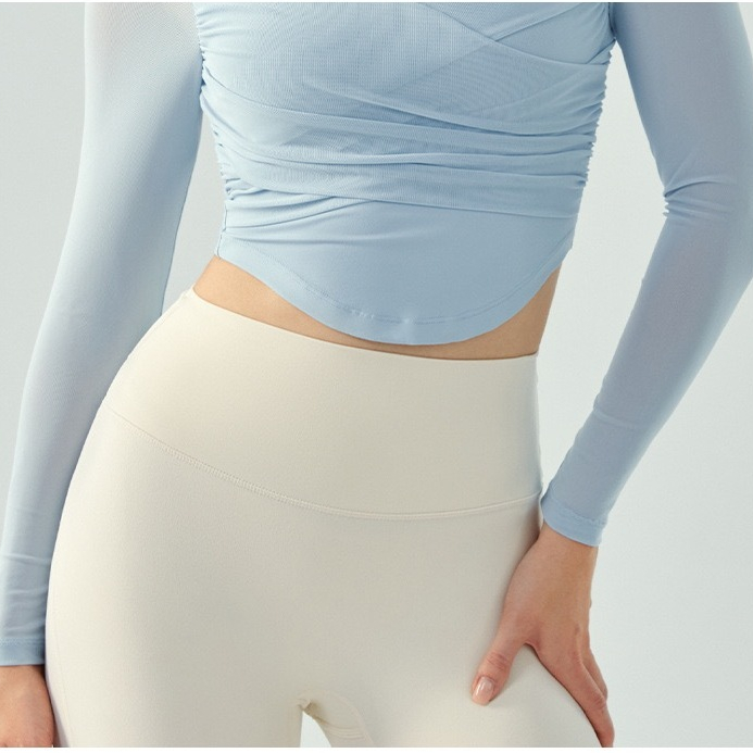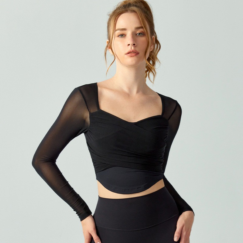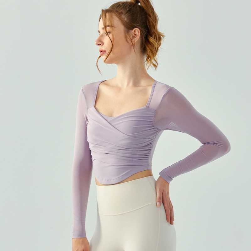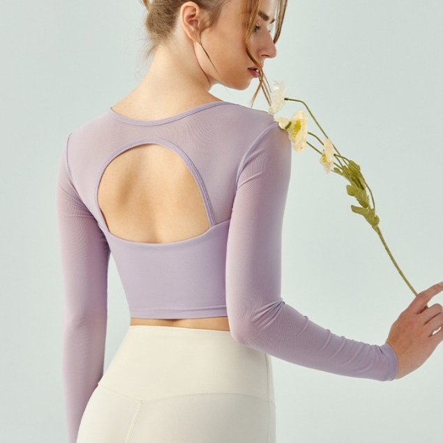 Hoppe Fumeng เสื้อโยคะแฟชั่นตาข่ายแขนยาวผู้หญิงบุนวม