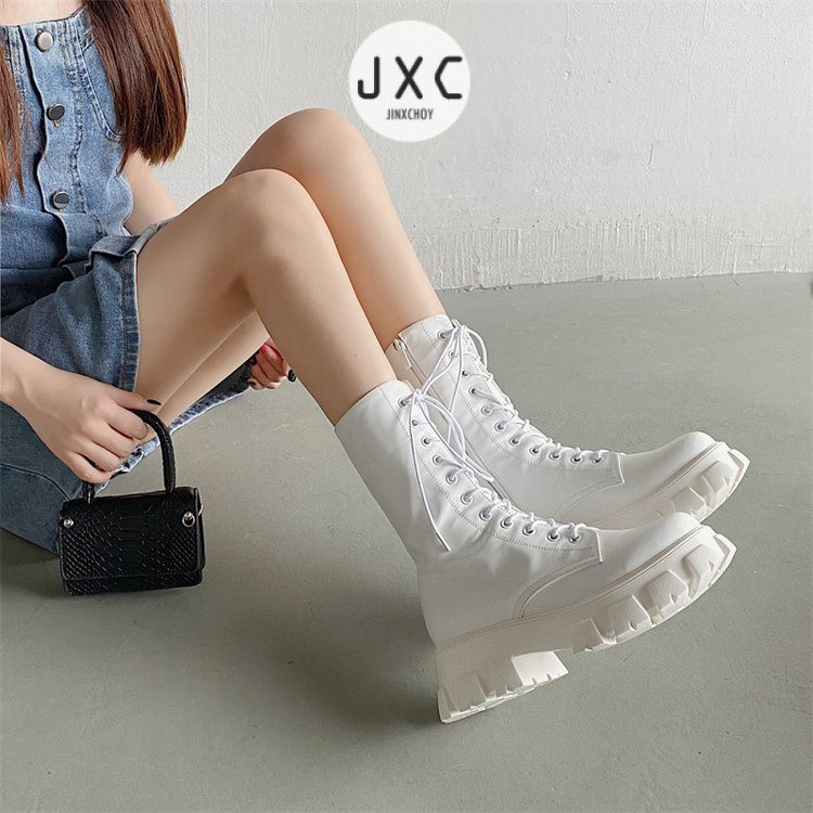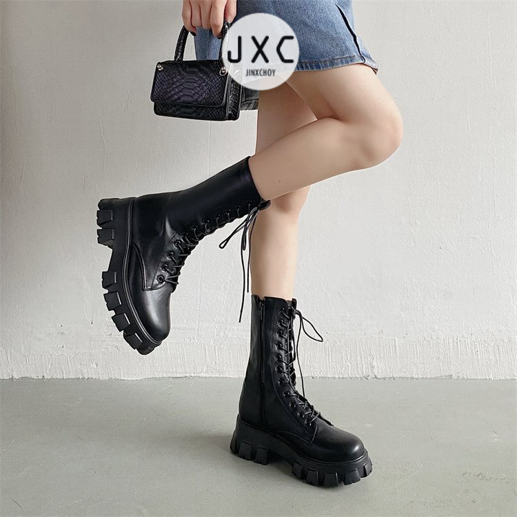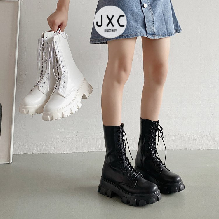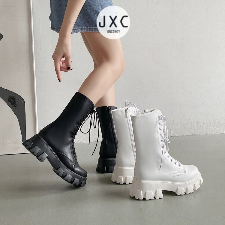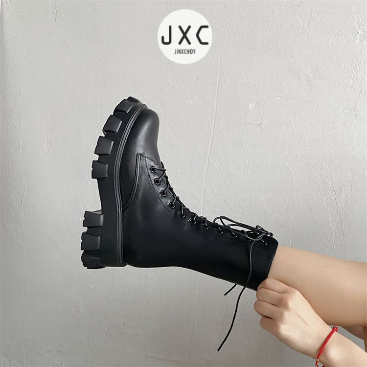รองเท้าบูทมาร์ติน พื้นหนา BLACKPINK หัวกลม แต่งลูกไม้ แต่งซิปด้านข้าง สีพื้น แฟชั่นทันสมัย สไตล์อังกฤษ