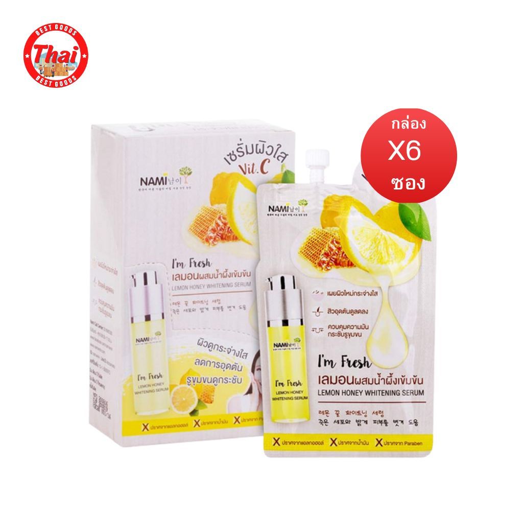 กล่อง x6ซอง นามิ แอม เฟรช วิตามินซีส้ม +อโล-เลมอน +มัลเบอร์รี่+เลมอนผสมน้ำผึ้ง+มะนาว-มะเฟืองสกัด+ใบบัวบก-แตงกวา