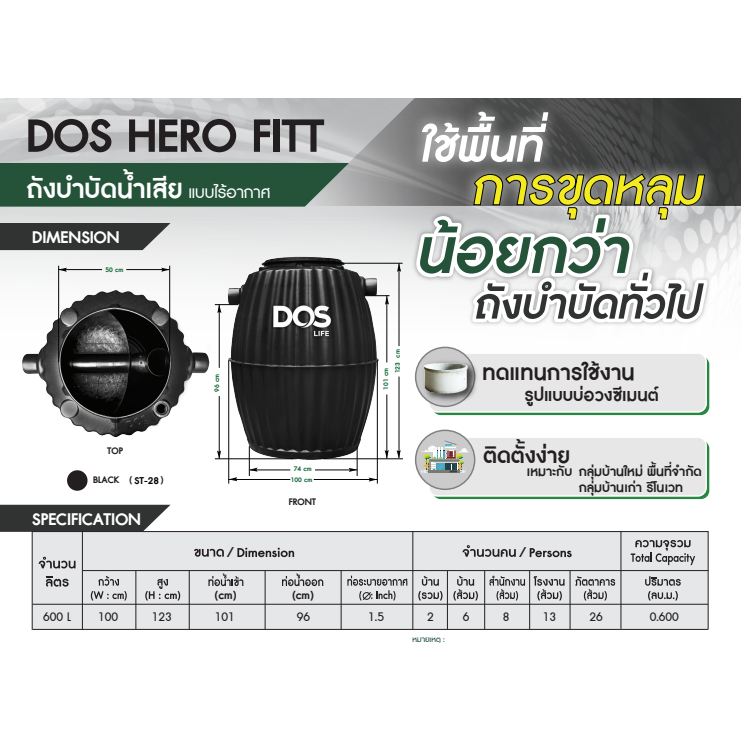 ถังบำบัด ถังบำบัดน้ำเสีย DOS รุ่น HERO FIT ดอส ฮีโร่ฟิต ประหยัดพื้นที่ อุปกรณ์ครบชุด