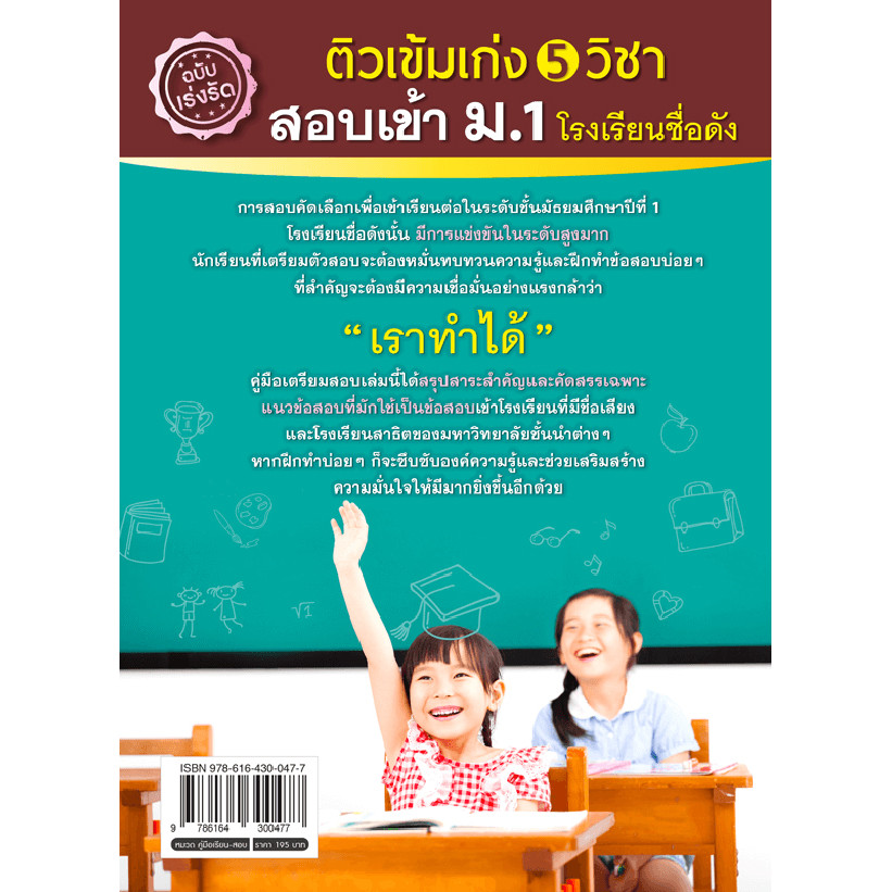การสอบคัดเลือกเพื่อเข้าเรียนต่อในระดับชั้นมัธยมศึกษาปีที่ 1 โรงเรียนชื่อดังนั้น มีการแข่งขันในระดับที่สูงมาก นักเรียนที่เตรียมตัวสอบจะต้องหมั่นทบทวนความรู้และฝึกทำข้อสอบบ่อยๆ ที่สำคัญจะต้องมีความเชื่อมั่นอย่างแรงกล้าว่าเราทำได้คู่มือเตรียมสอบเล่มนี้ ได้สร