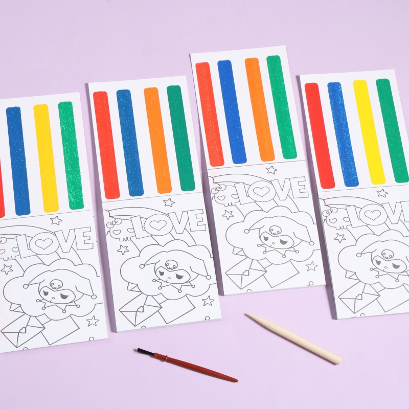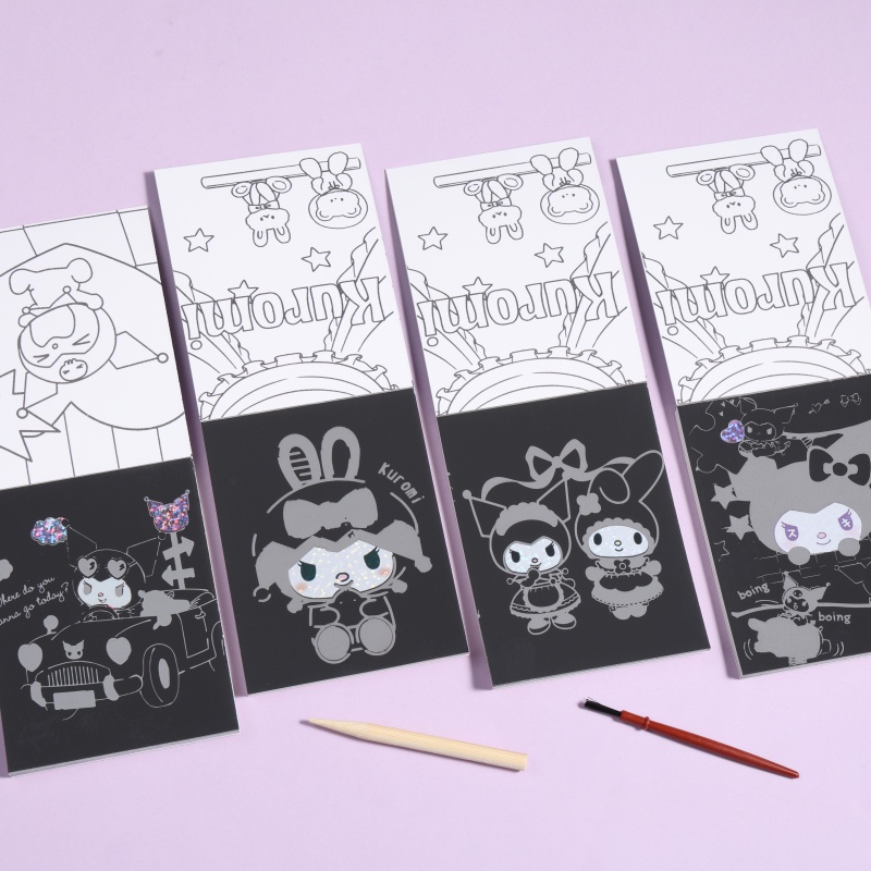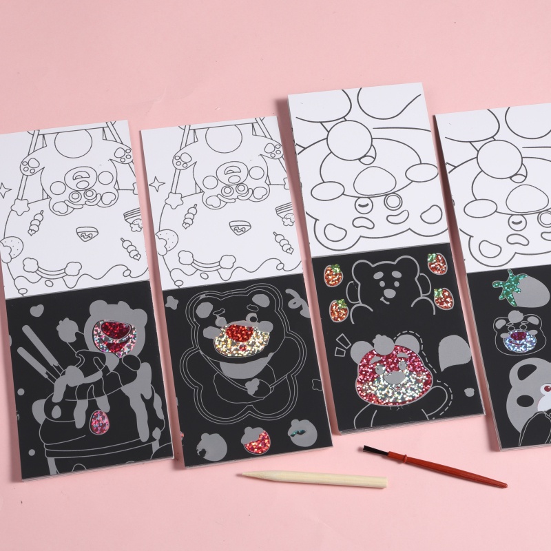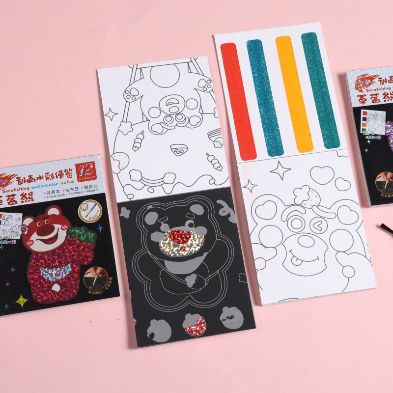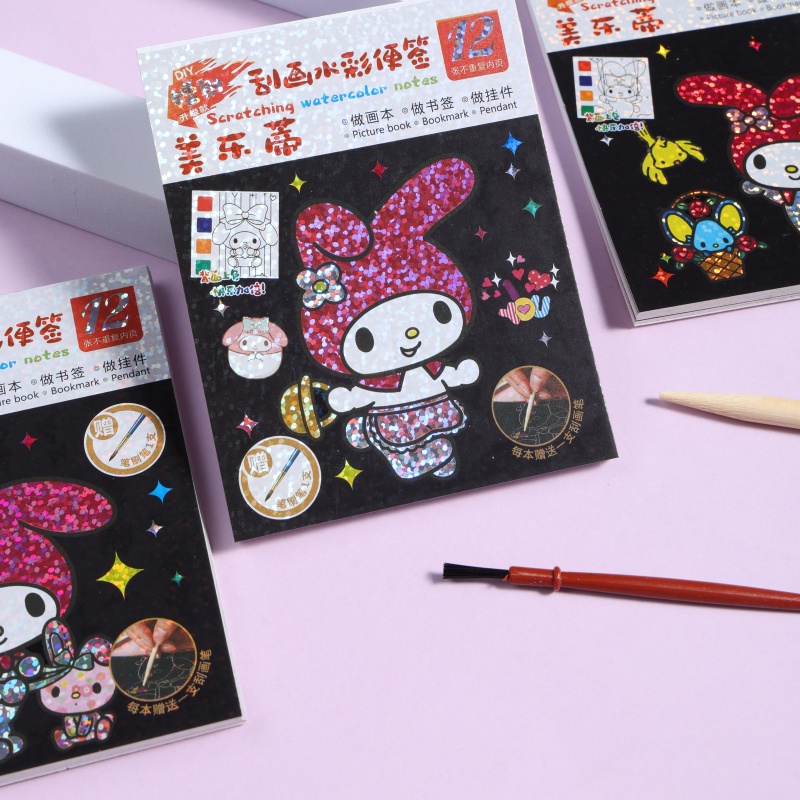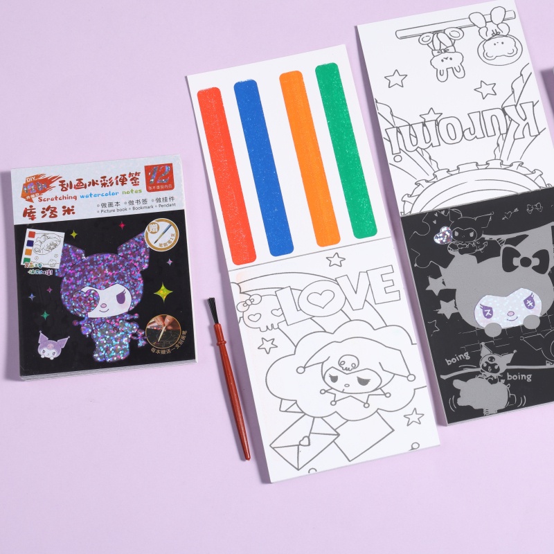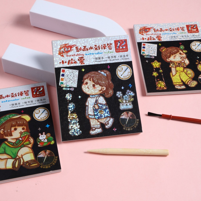 ?แต่ละชุดประกอบด้วย: แผ่นบันทึกภาพวาดรอยขีดข่วน 1 แผ่น + แปรงขูดขีด 1 ชิ้น + ปากกาแปรง 1 ด้าม