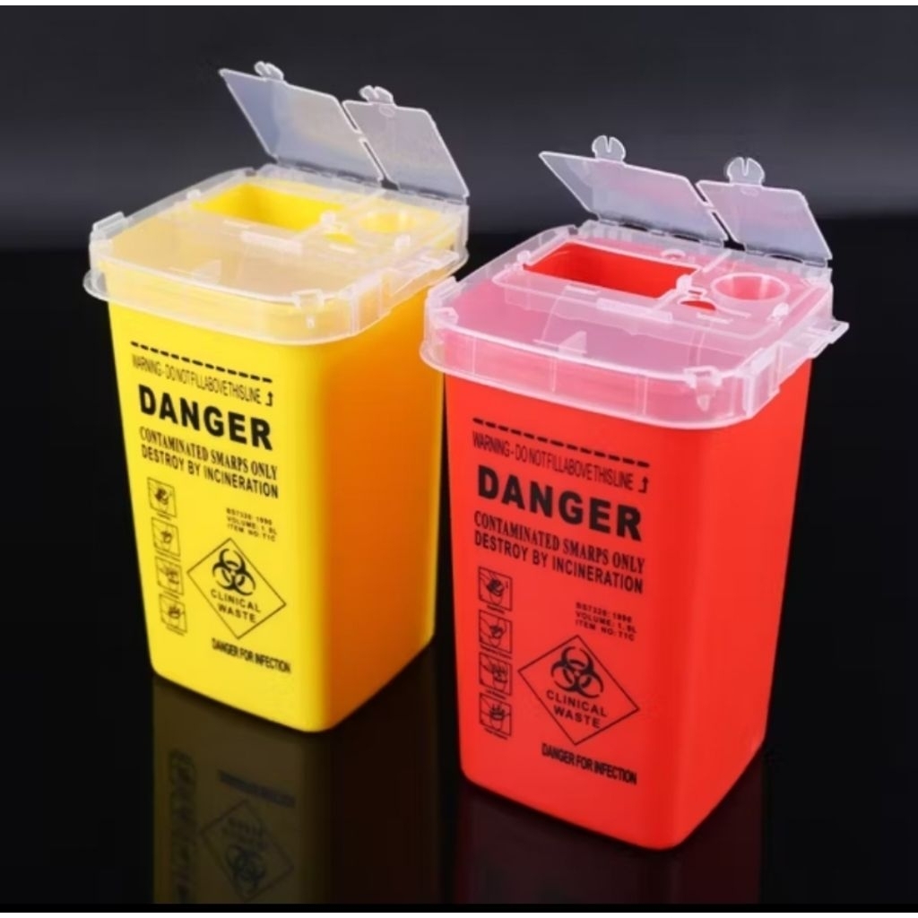 วัสดุ : พลาสติก กล่อง สำหรับทิ้งเข็ม หรือวัสดุอันตรายที่ปนเปื้อน