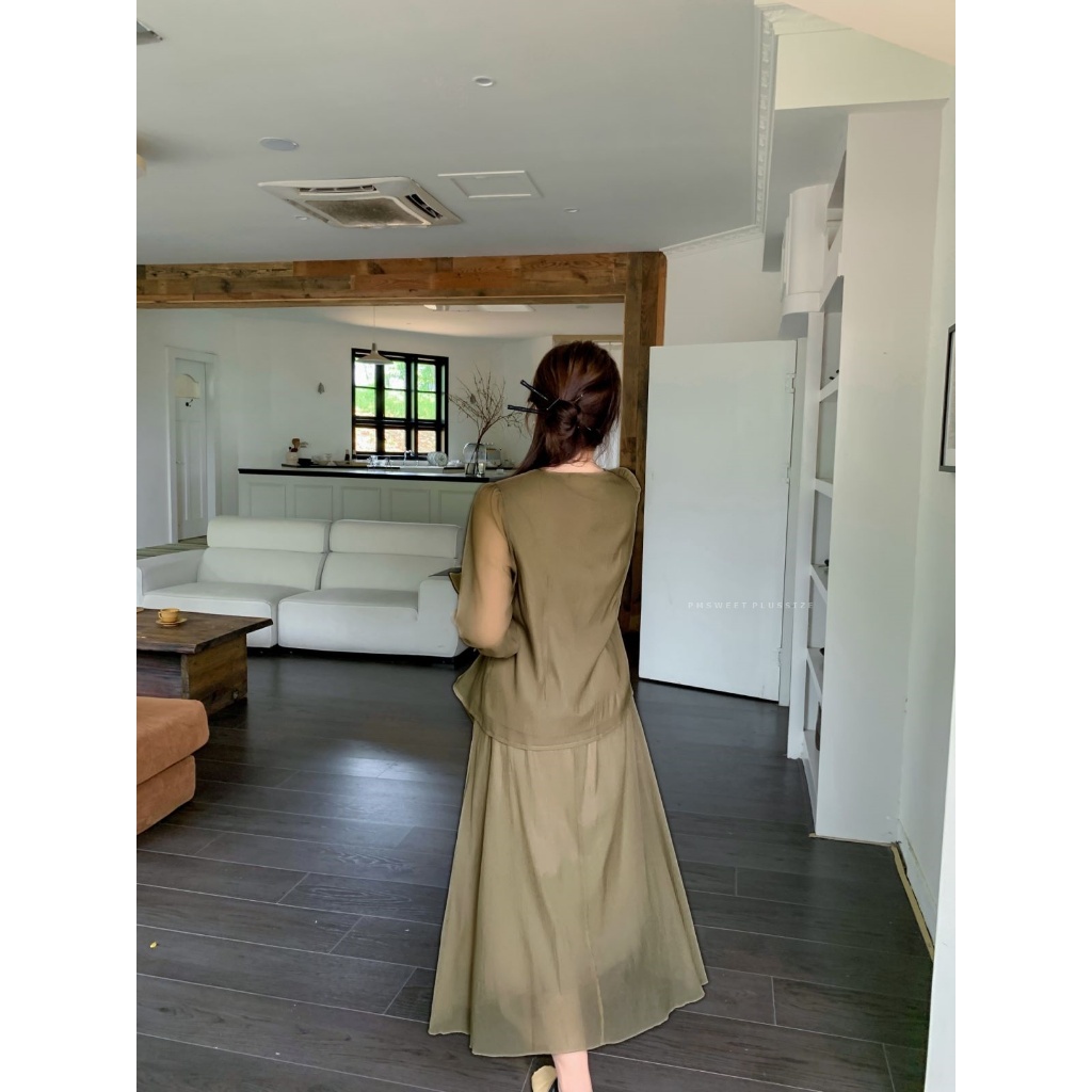 ชุดเซตผ้าไหมผสมฝ้ายเนื้อย่นงานสวย เสื้อคอวีงานมีซับในในตัวแต่งกระดุมหน้าสไตล์จีน มาพร้อมกระโปรงยาวงานมีซับในในตัว เอวยางยืด