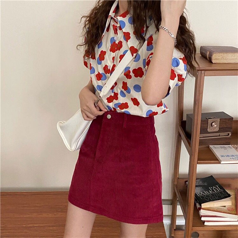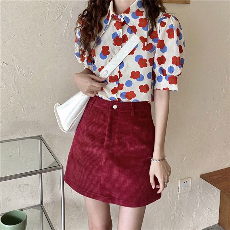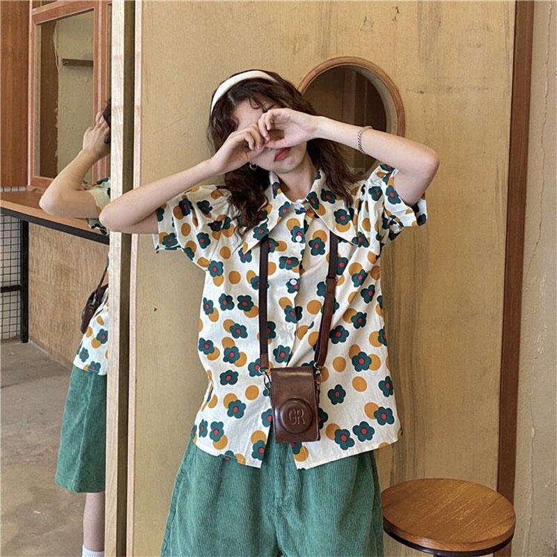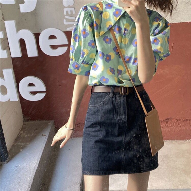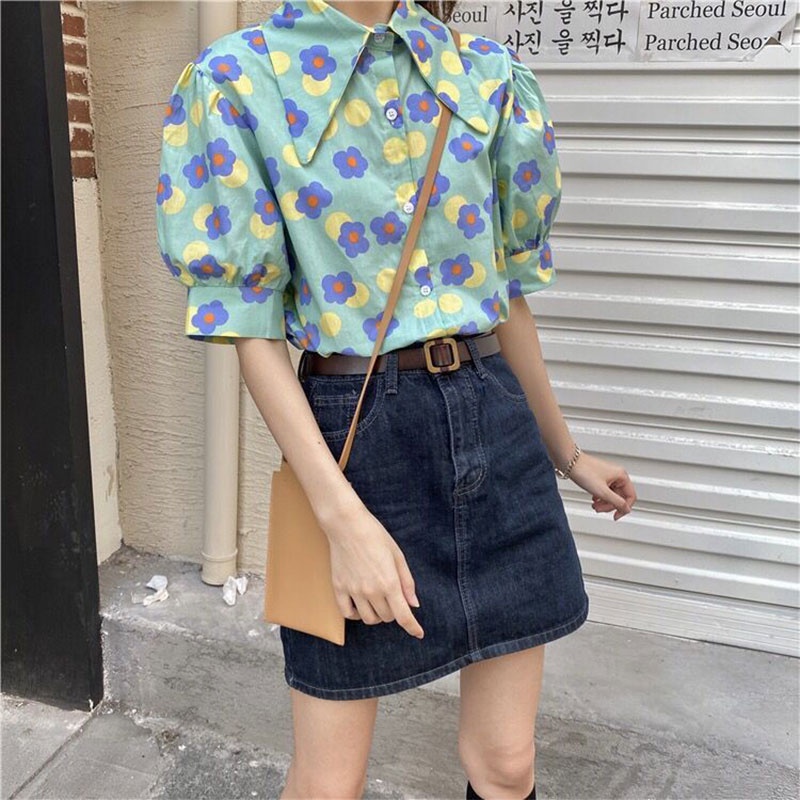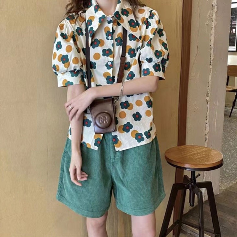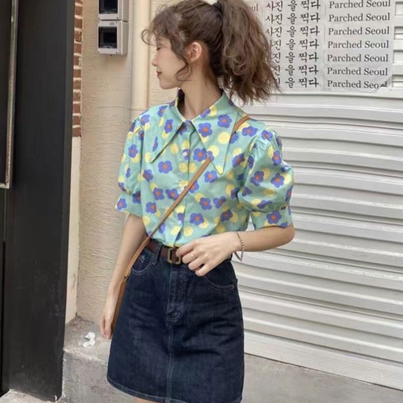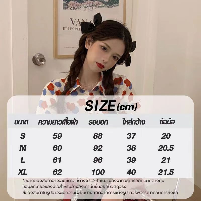 เสื้อเชิ้ตแขนพัฟพิมพ์ลายดอกไม้ เสื้อผ้าผู้หญิงทรงสวยราคาถูกพร้อมส่งมือหนึ่ง เสื้อ สงกรานต์ ผู้หญิง