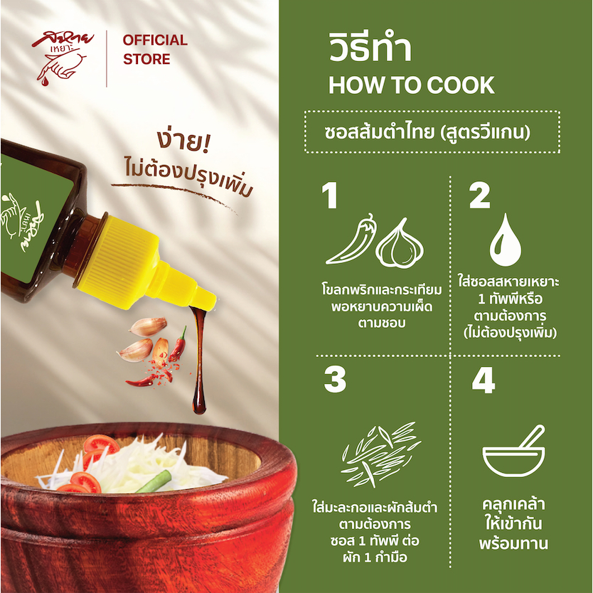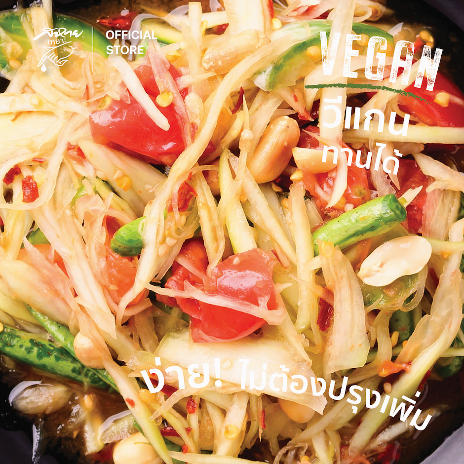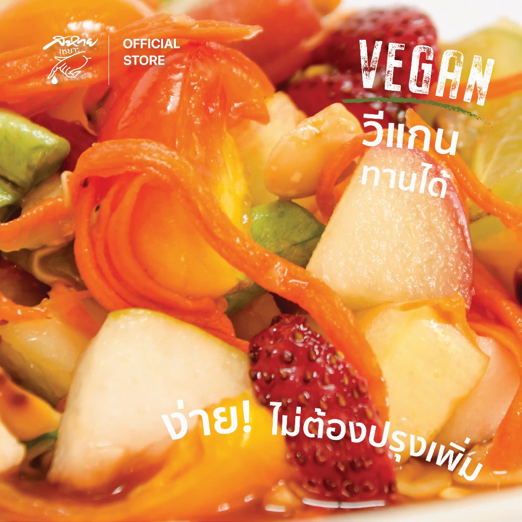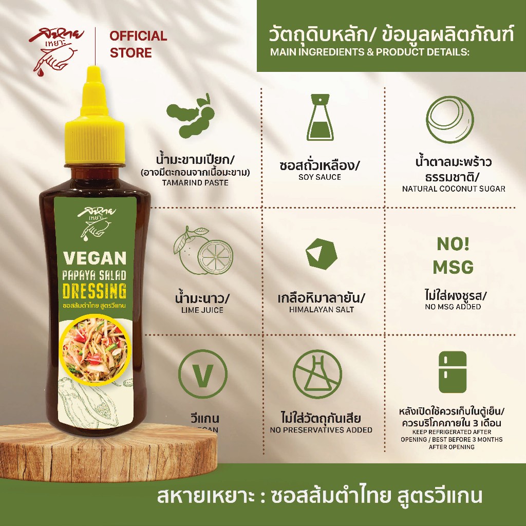 ซอสส้มตำไทยส สูตรวีแกน ตรา สหายเหยาะ น้ำปรุงรสทำส้มตำไทย ตำข้าวโพด ตำผลไม้ จบที่ขวดเดียว จบที่ขวดเดียว ไม่ต้องปรุงเพิ่ม เจ/วีแกน/มังสวิรัติ ซอสส้มตำไทย รสชาติถูกใจทั้งคนไทยและต่างชาติ ?ซอสเคี่ยวจากน้ำตาลมะพร้าว ?ตัวซอสมีความเปรี้ยวจากมะขามเปียกและน้ำมะน