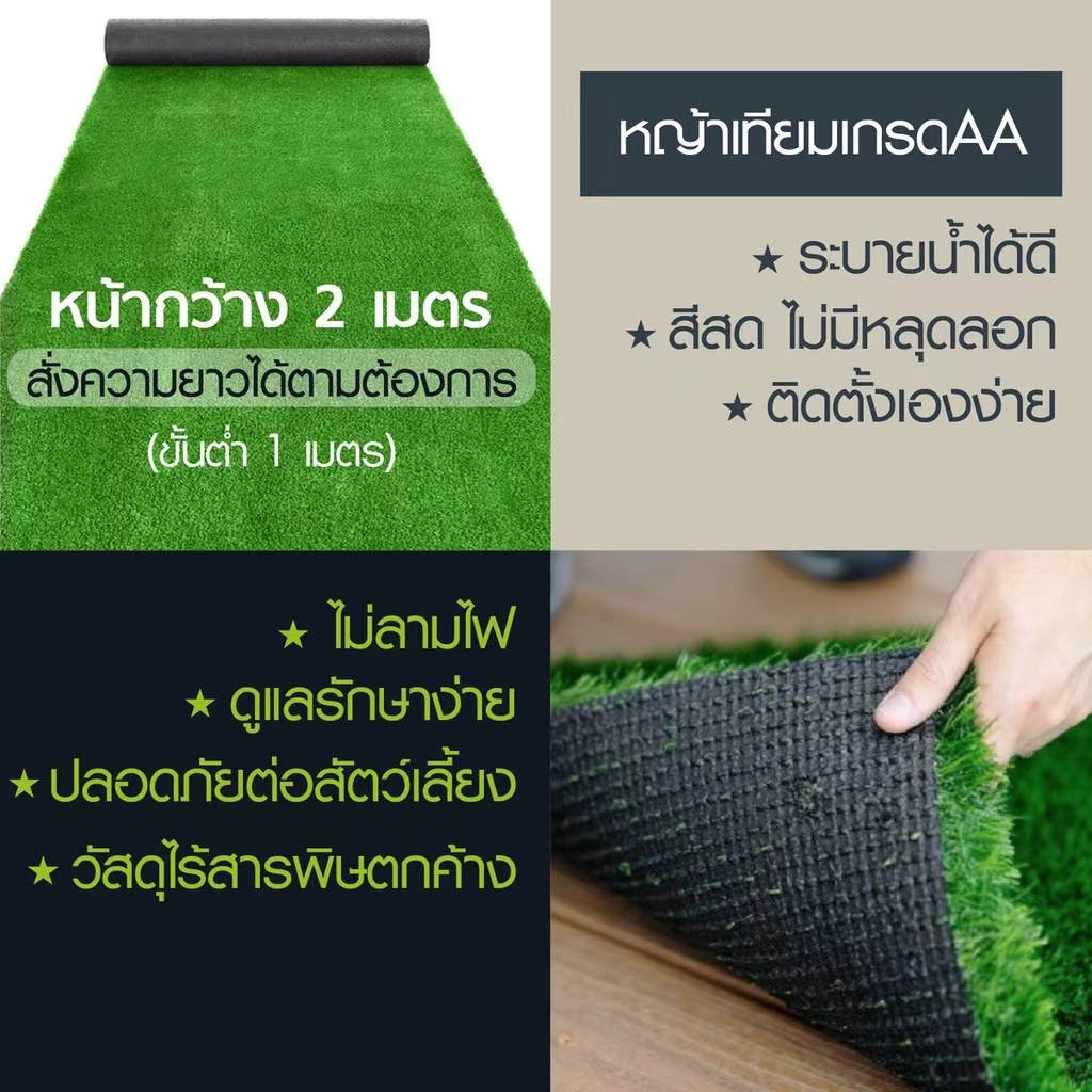 หญ้าเทียม (2×3เมตร) หนา1.5 / 2 / 3ซม. หญ้าเสมือนจริงสำหรับปูภายในและภายนอก มีรูระบายน้ำ ไม่ลามไฟ