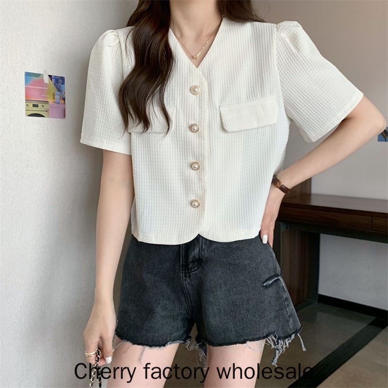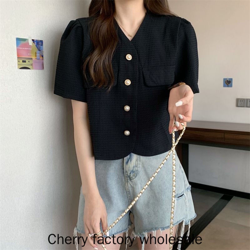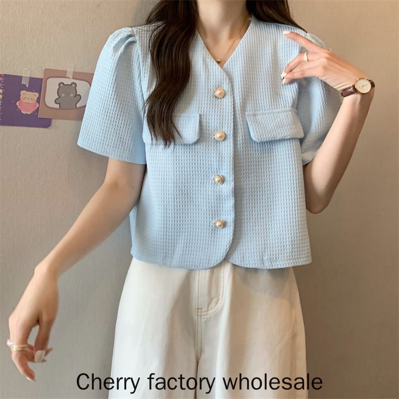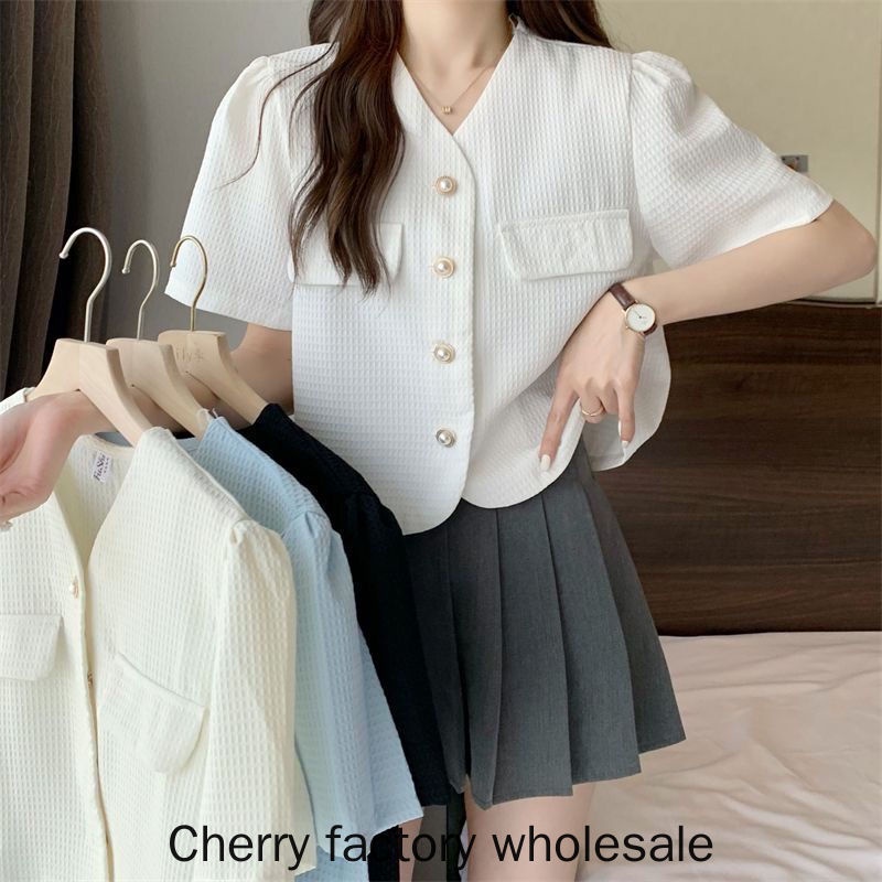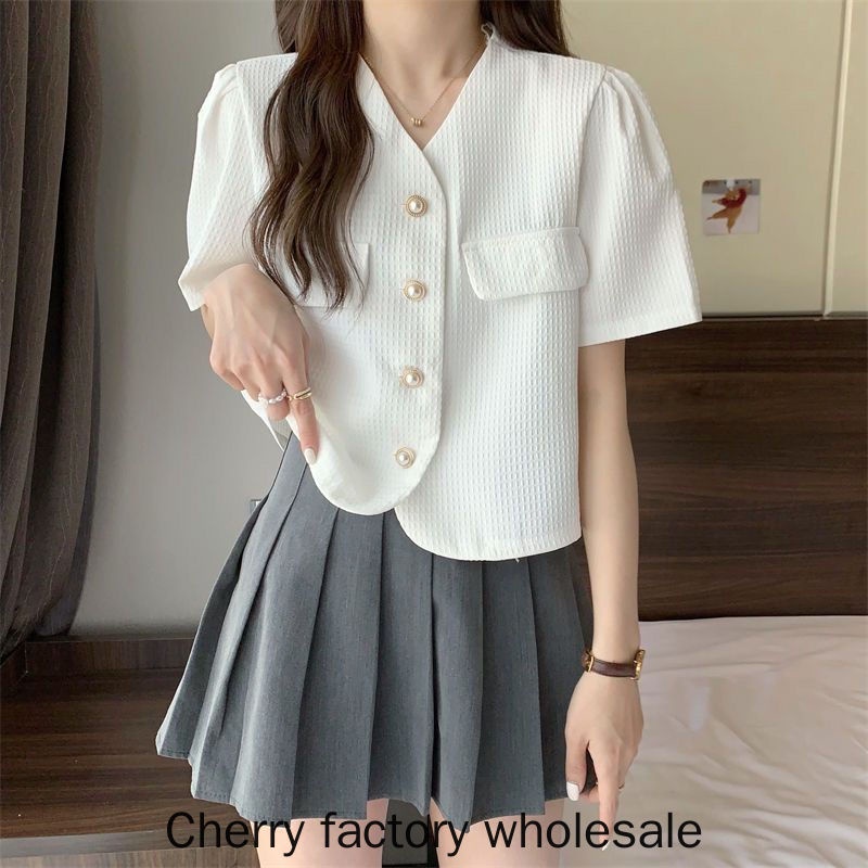เสื้อคาร์ดิแกนแขนสั้น คอวี แต่งกระดุม ประดับไข่มุก สไตล์เกาหลี แฟชั่นใหม่ สําหรับผู้หญิง