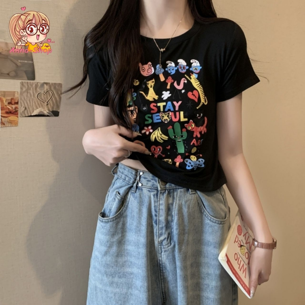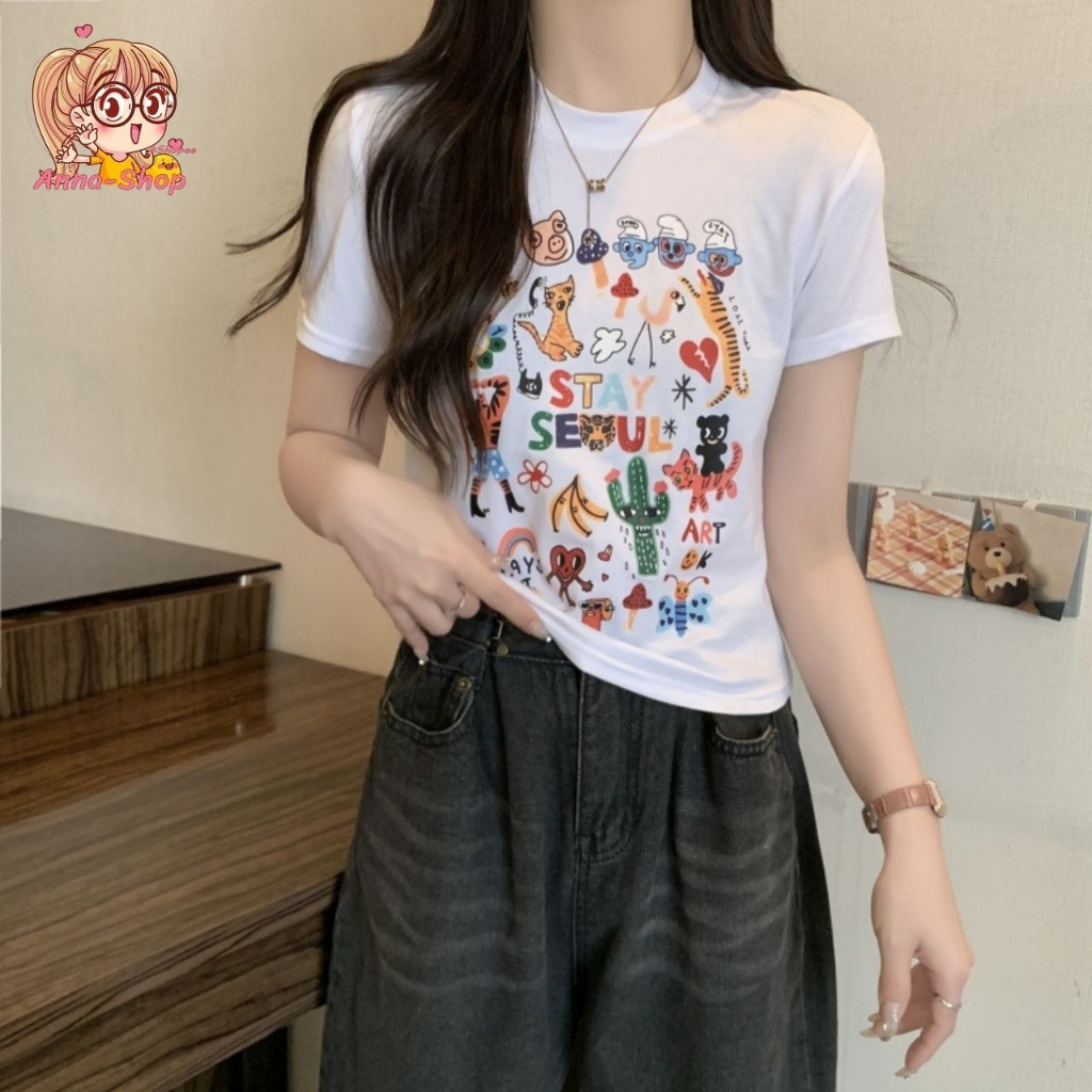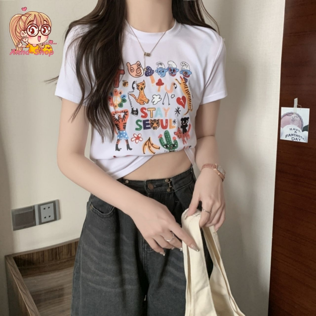 annacny เสื้อครอป พิมพ์ลายการ์ตูน เสื้อยืดผู้หญิง สวมใส่สบาย ลายชัดน่ารักมาก TS1132