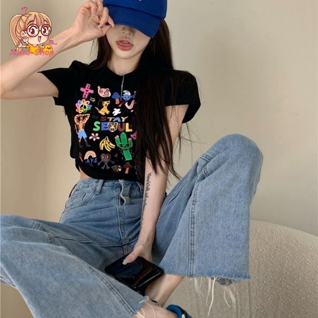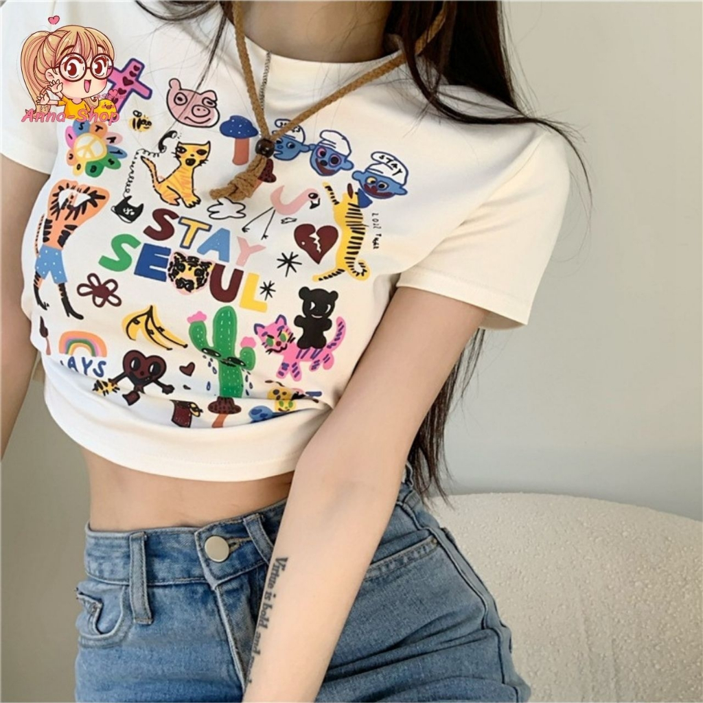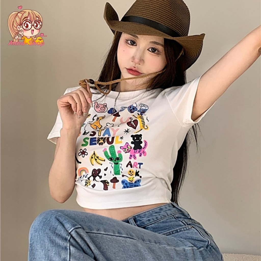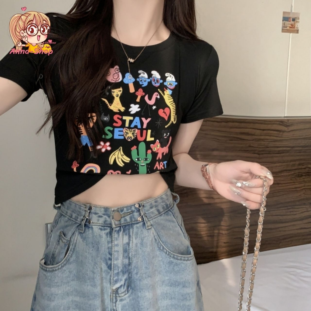 annacny เสื้อครอป พิมพ์ลายการ์ตูน เสื้อยืดผู้หญิง สวมใส่สบาย ลายชัดน่ารักมาก TS1132