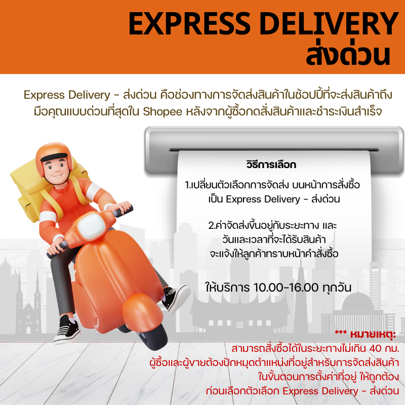 # Express Delivery ส่งด่วน ช่องทางการจัดส่งสินค้าในช้อปปี้ที่จะส่งสินค้าถึงมือคุณแบบด่วนที่สุดใน Shopee หลังจากผู้ซื้อกดสั่งสินค้าและชำระเงินสำเร็จ ลูกค้าจะได้รับสินค้าภายในวันที่สั่ง ค่าส่งจะขึ้นอยู่กับระบบทาง shop