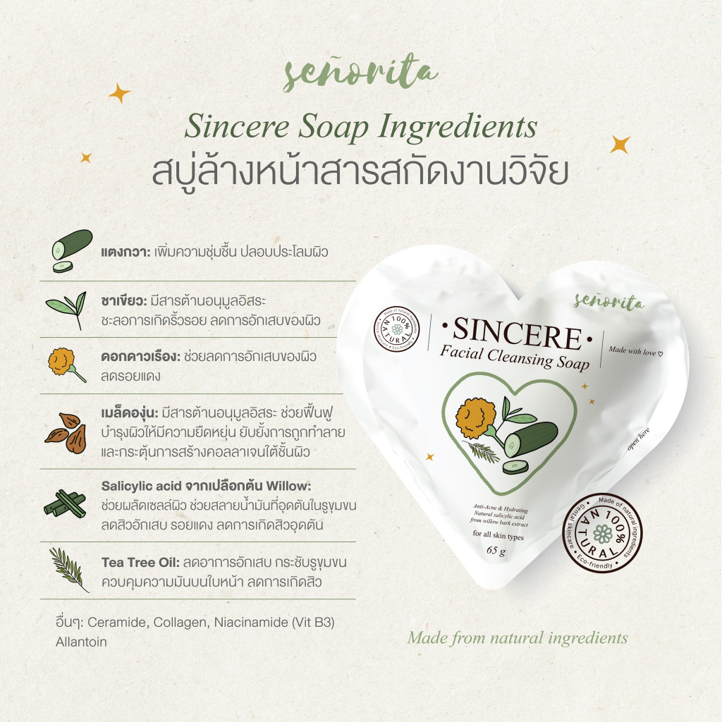 (ใช้โค้ดเหลือ 49.-) Seño Sincere Facial Cleansing Soap ซินญอ สบู่ซินเซีย ลดสิว ลดความมัน เนียนนุ่ม ชุ่มชื้น