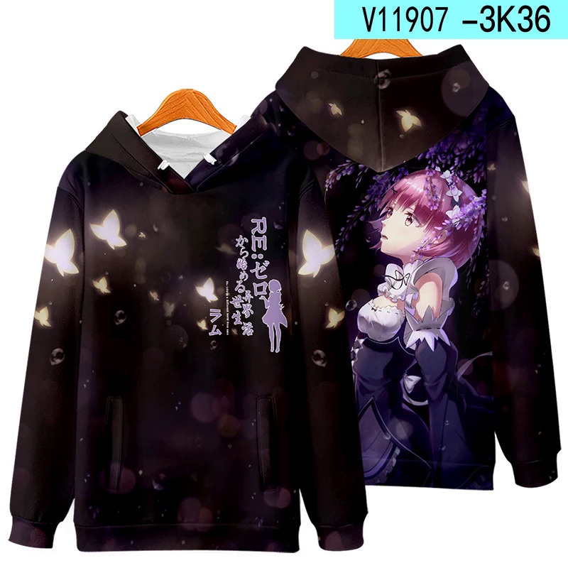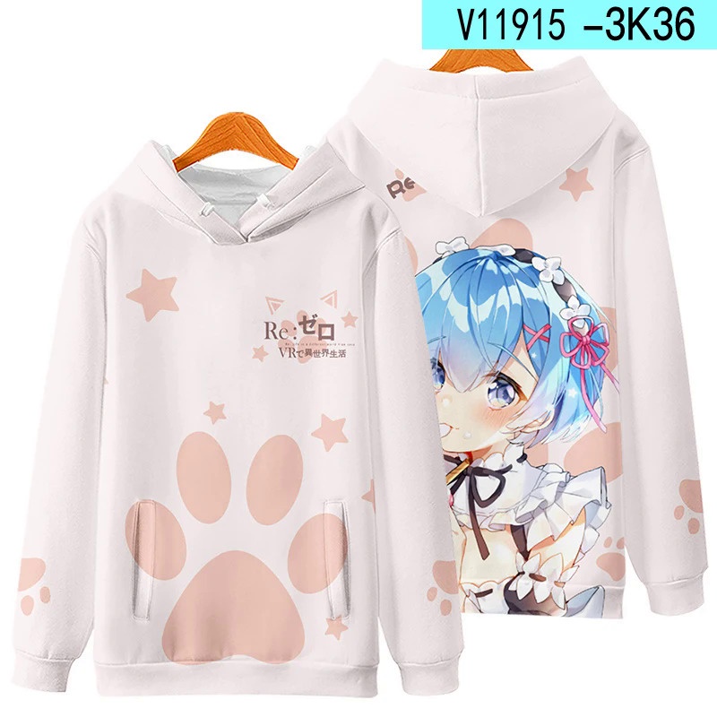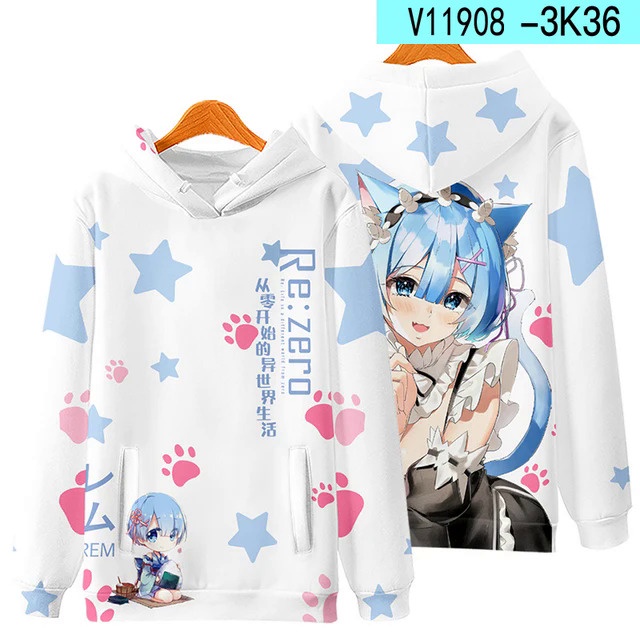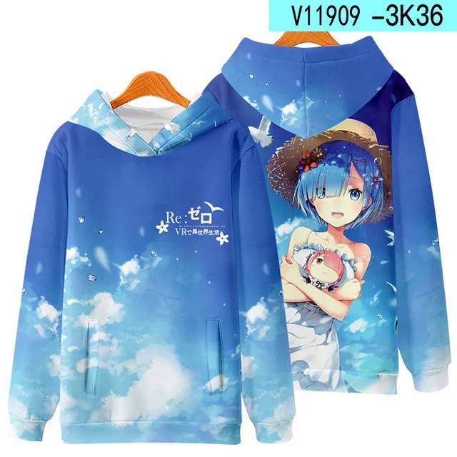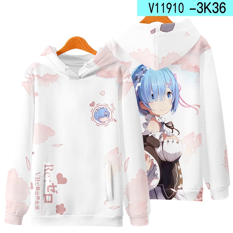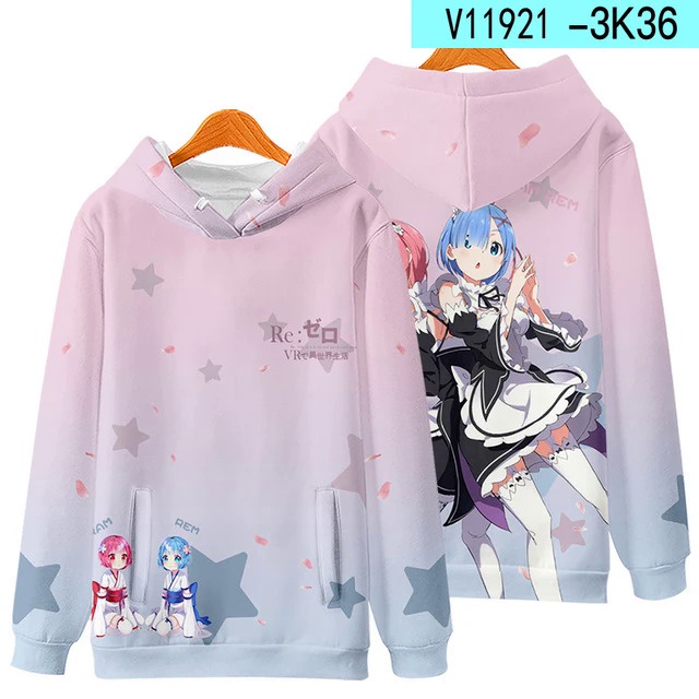เสื้อกันหนาว มีฮู้ด พิมพ์ลายอนิเมะ Re Zero Rem and Ram สไตล์สตรีท สําหรับผู้ชาย และผู้หญิง
