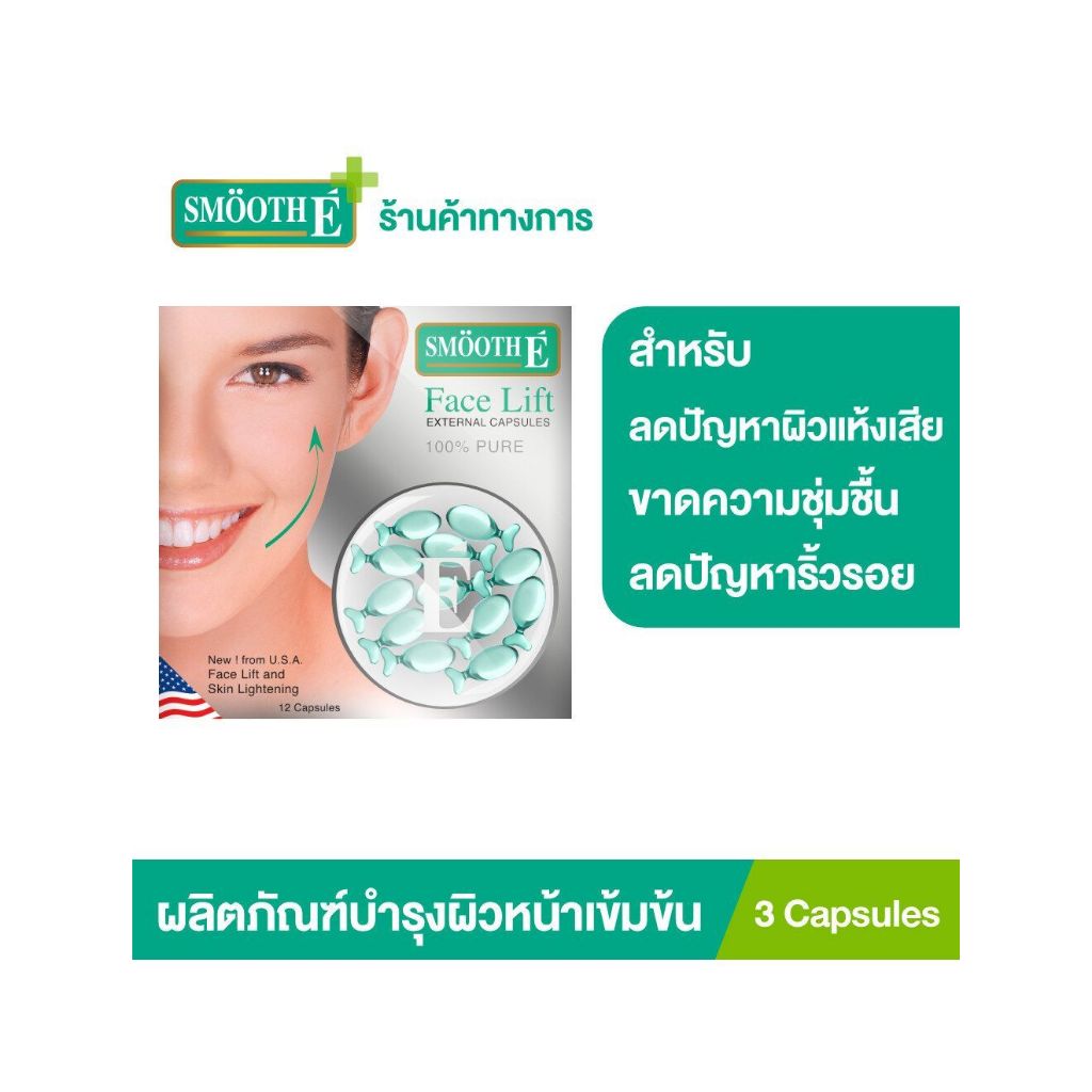 Smooth E Face Lift (3,12 capsules) ผลิตภัณฑ์บำรุงผิวหน้าชนิดเข้มข้น ช่วยยกกระชับผิวหน้าไม่ให้หย่อนคล้อย ให้ผิวหน้าตึง พร้อมกระชับรูขุมขนด้วยสารสกัดจากธรรมชาติคัดพิเศษกว่า 12 ชนิด และวิตามินอีเข้มข้น ผลิตภัณฑ์บำรุงผิวหน้าชนิดเข้มข้น อุดมด้วยสา