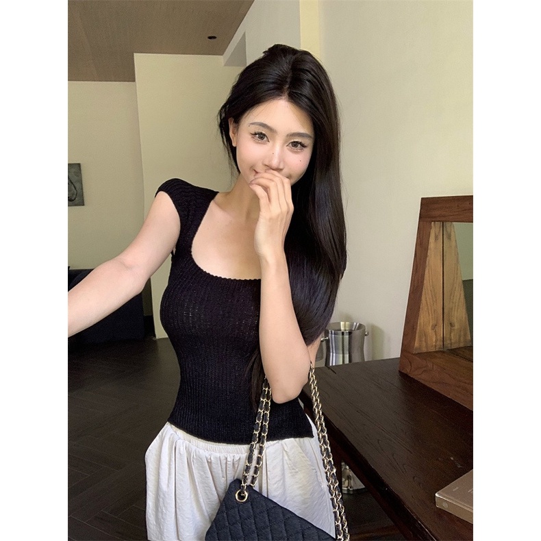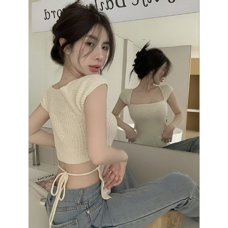 JJ Shop?พร้อมส่ง เสื้อไหมพรมคอเหลี่ยม แขนสั้นเว้าหลังผูกหลัง สีพื้น “12359-2” -C