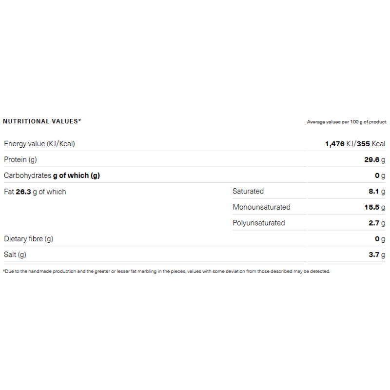แฮมส่วนขาอย่างดี มีไขมันสีทองอมสีชมพู เนื้อนุ่มๆ เนื้อมีสีแตกต่างกันไปตั้งแต่สีแดงเข้มไปจนถึงสีชมพูอ่อน โดยมีลายหินอ่อนสีสดใสที่ละลายบนเพดานปาก ให้รสชาตินุ่มนวลและละเอียดอ่อน ในตอนแรกจะหวานเล็กน้อย ตามด้วยไขม