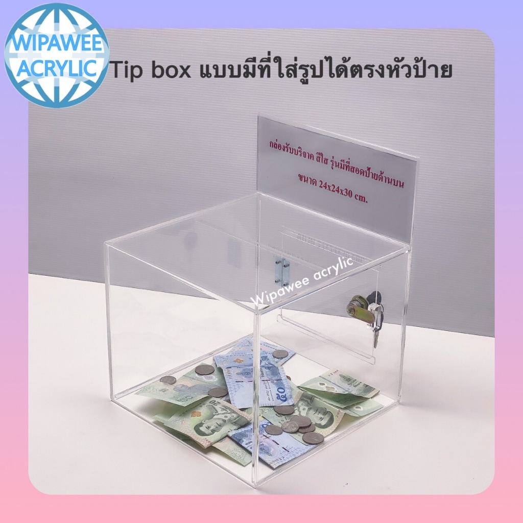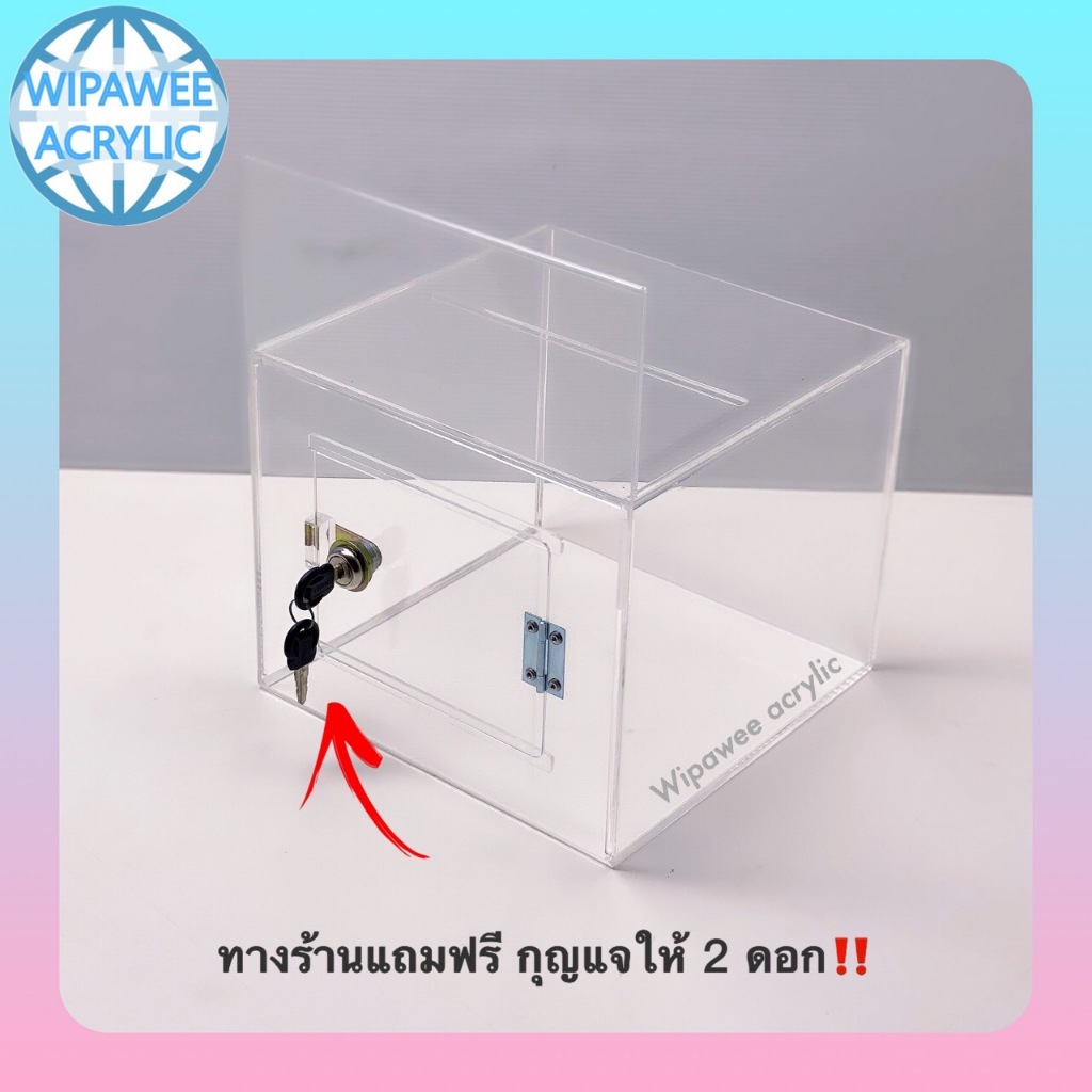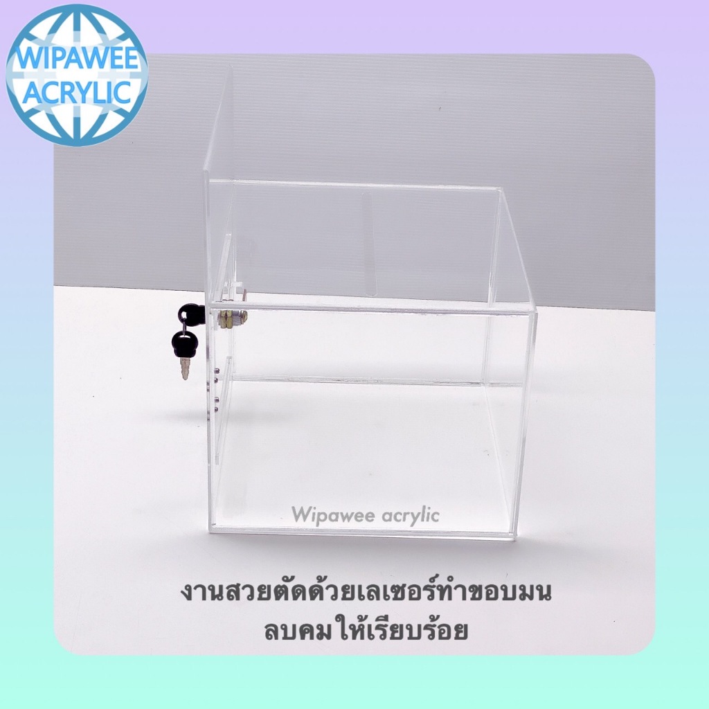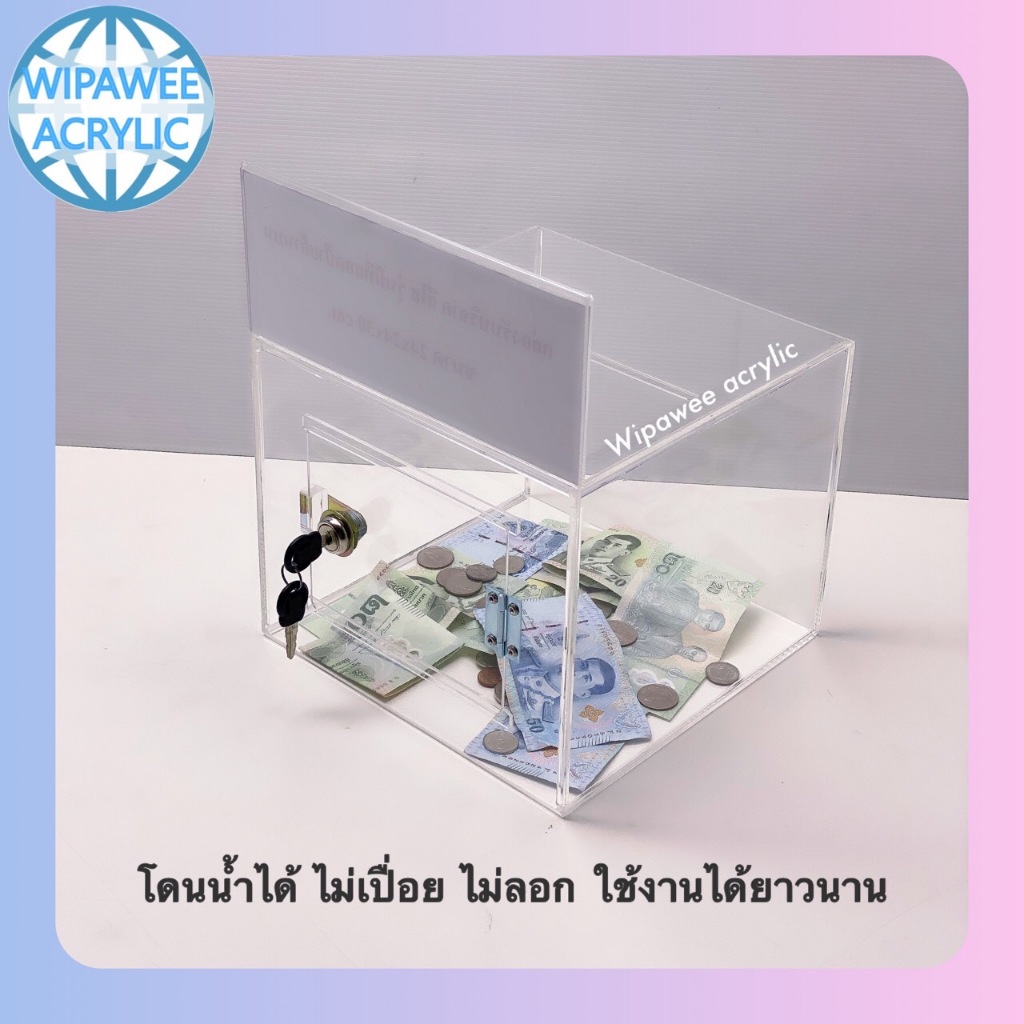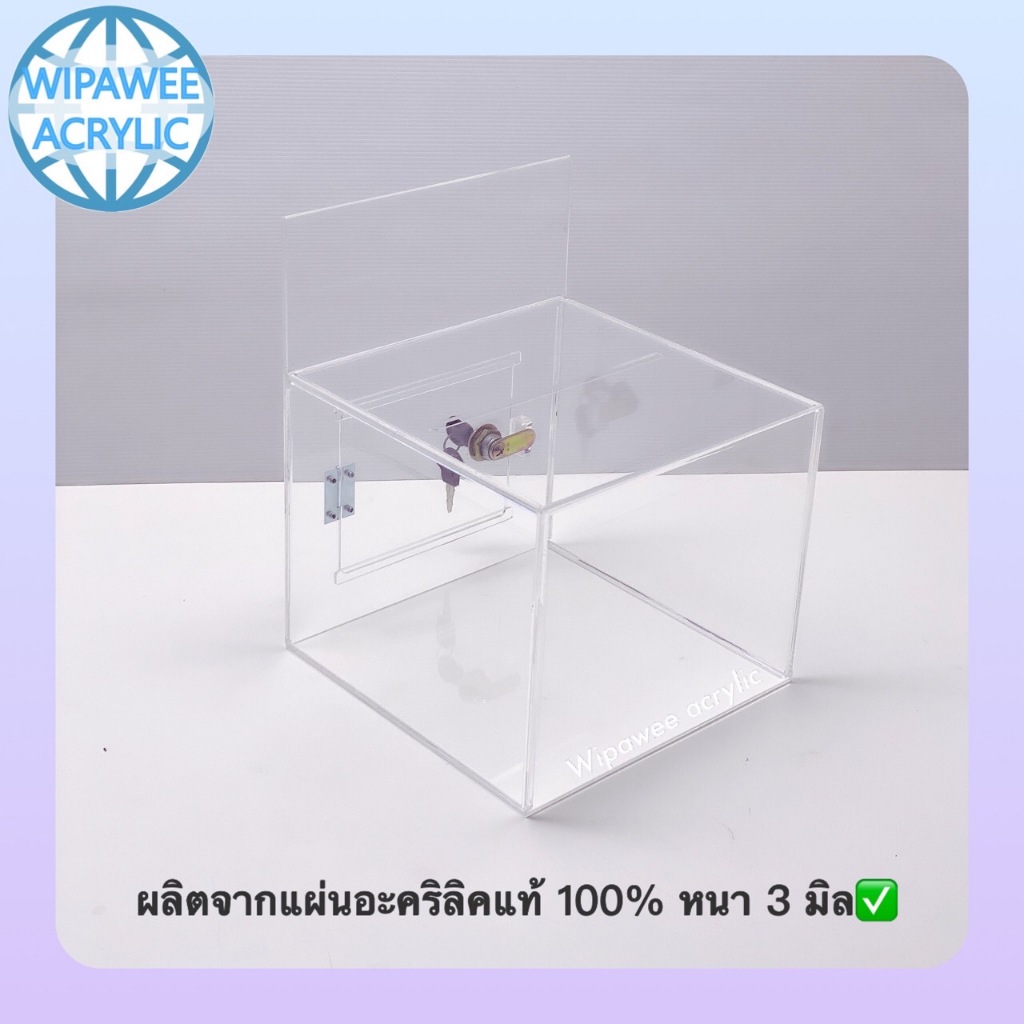 wipawee กล่องรับบริจาค สีใส รุ่นมีป้ายเสียบกระดาษด้านบน ขนาด 24x24x30 cm.
