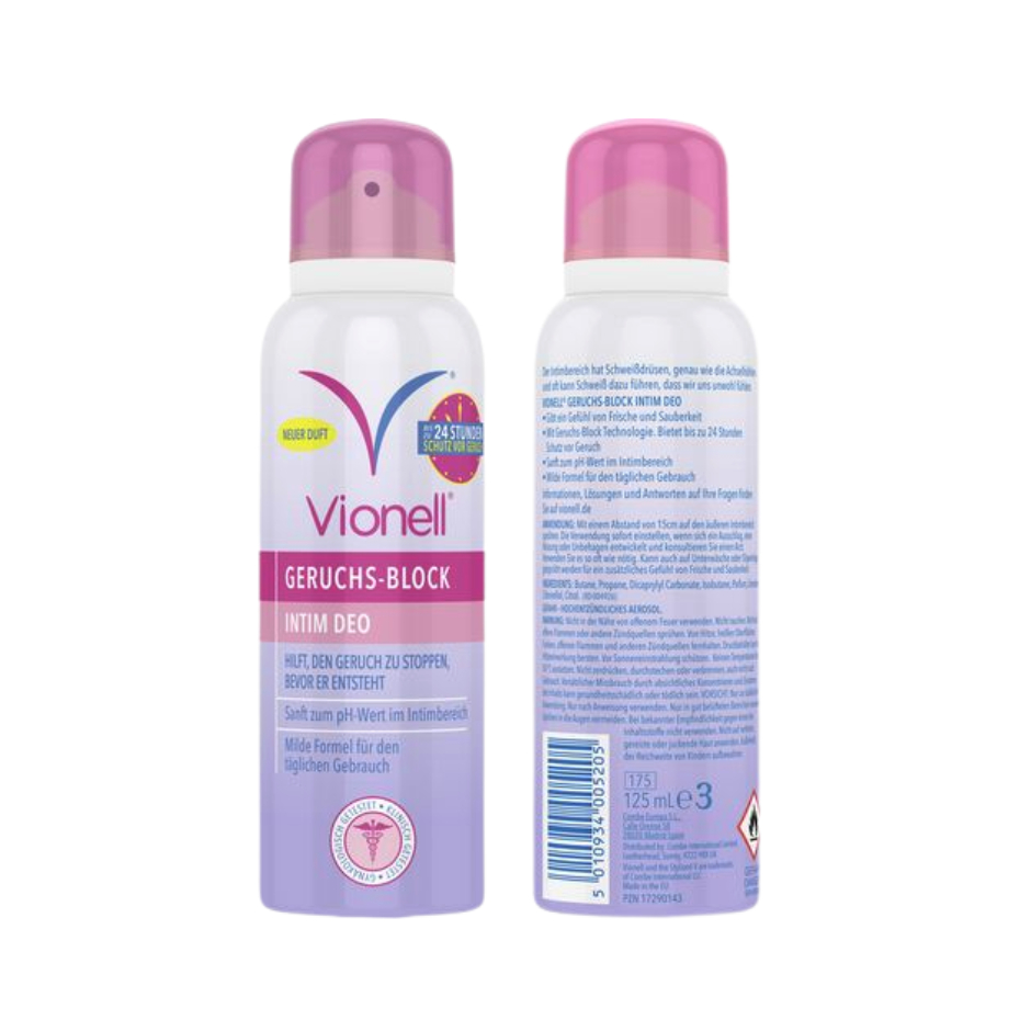 สเปรย์สำหรับจุดซ่อนเร้น ผู้ต้องเดินทางไกล Vionell odor block intimate deodorant 125 ml ไวโอเนล อินทิเมท จากเยอรมัน