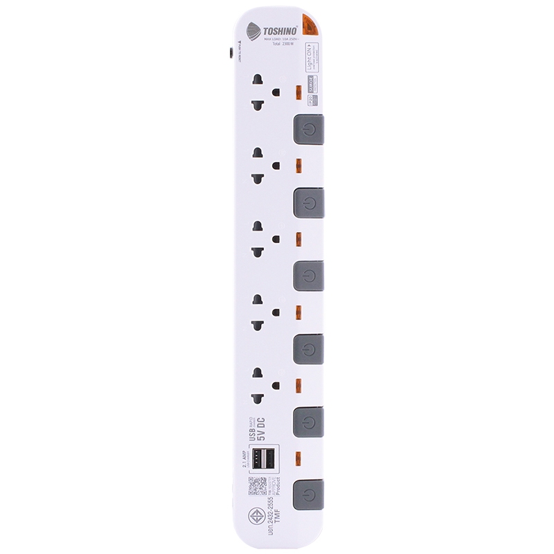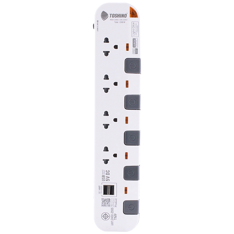 ปลั๊กไฟ ปลั๊กพ่วง มาตรฐาน มอก. ยี่ห้อ Toshino รุ่น P 2/3/4/5 ช่อง แยกสวิทซ์ + 2USB สาย 3/5 เมตร รางปลั๊กไฟ 2300 วัตต์