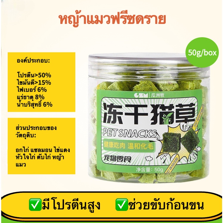 หญ้าแมวฟรีซดราย? ขนมสัตว์เลี้ยง หญ้าแมวอบแห้ง อกไก่ผสมต้นอ่อนข้าวสาลีฟรีซดราย ขนมแมวฟรีซดราย ช่วยสำรอกก้อนขน 50g