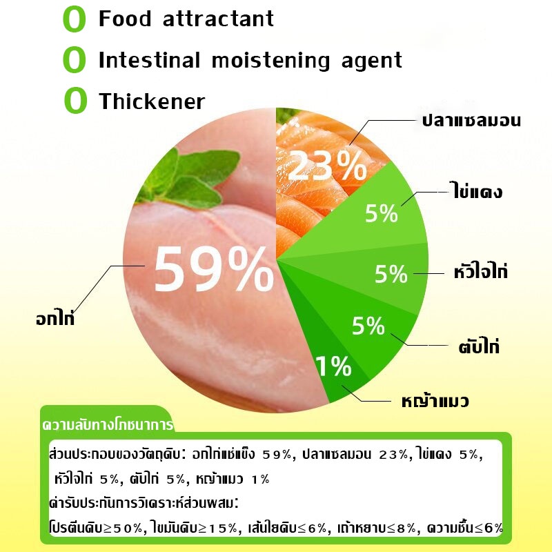 ส่วนประกอบของวัตถุดิบ: อกไก่แช่แข็ง 59%, ปลาแซลมอน 23%, ไข่แดง 5%, หัวใจไก่ 5%, ตับไ